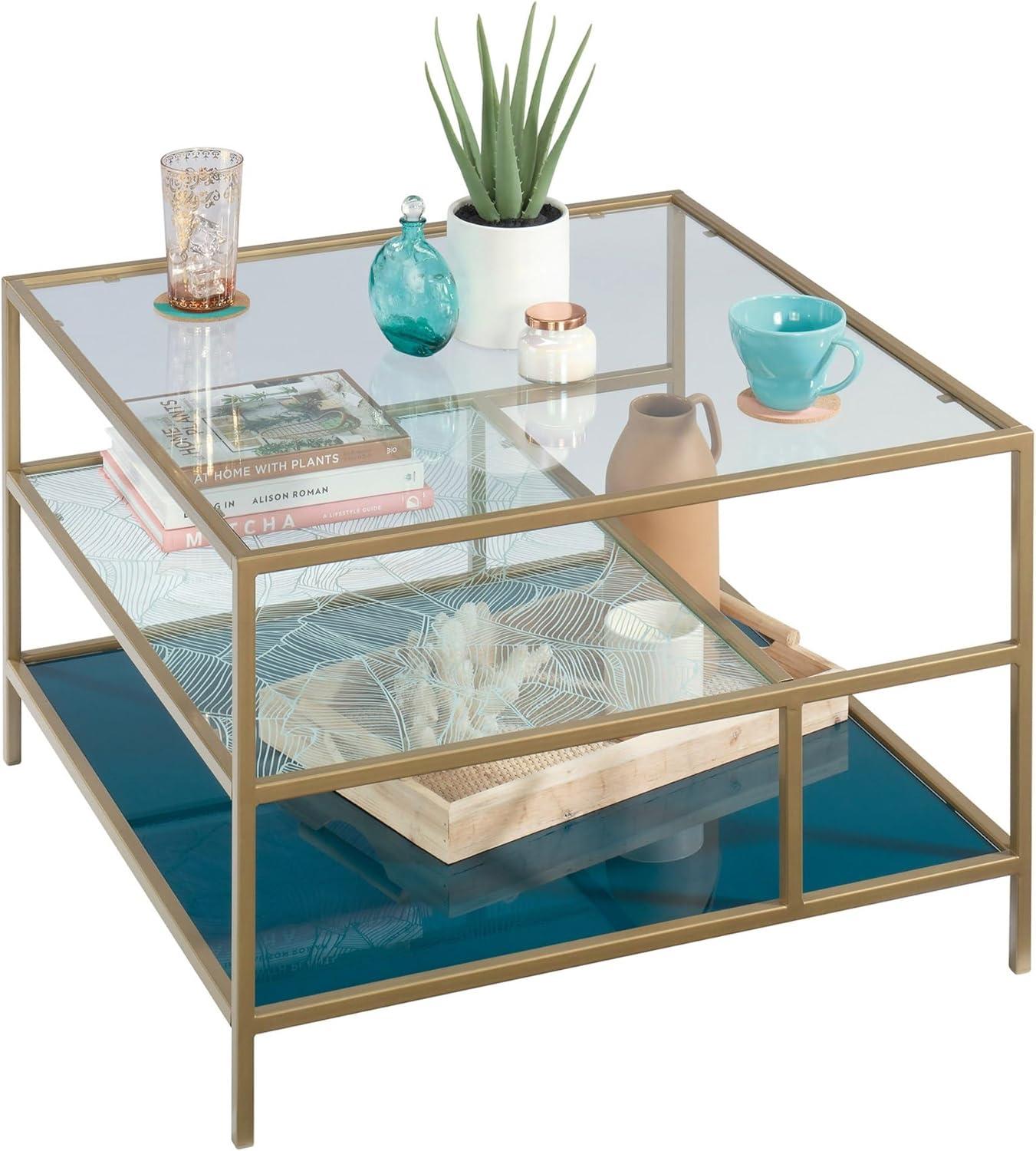 With its satin gold finish and sleek powder-coated metal frame, this coffee table effortlessly bridges the gap between coastal charm and contemporary elegance. The square shape and tempered glass top bring a modern edge that enhances minimalist and industrial interiors, while the delicate banana leaf pattern etched on the middle glass shelf introduces a subtle organic element perfect for bohemian and coastal-themed rooms. Its layered glass design, including the teal-tinted silk-screened lower shelf, adds depth and color without overwhelming the space, making it a versatile addition to both vibrant and serene settings alike.