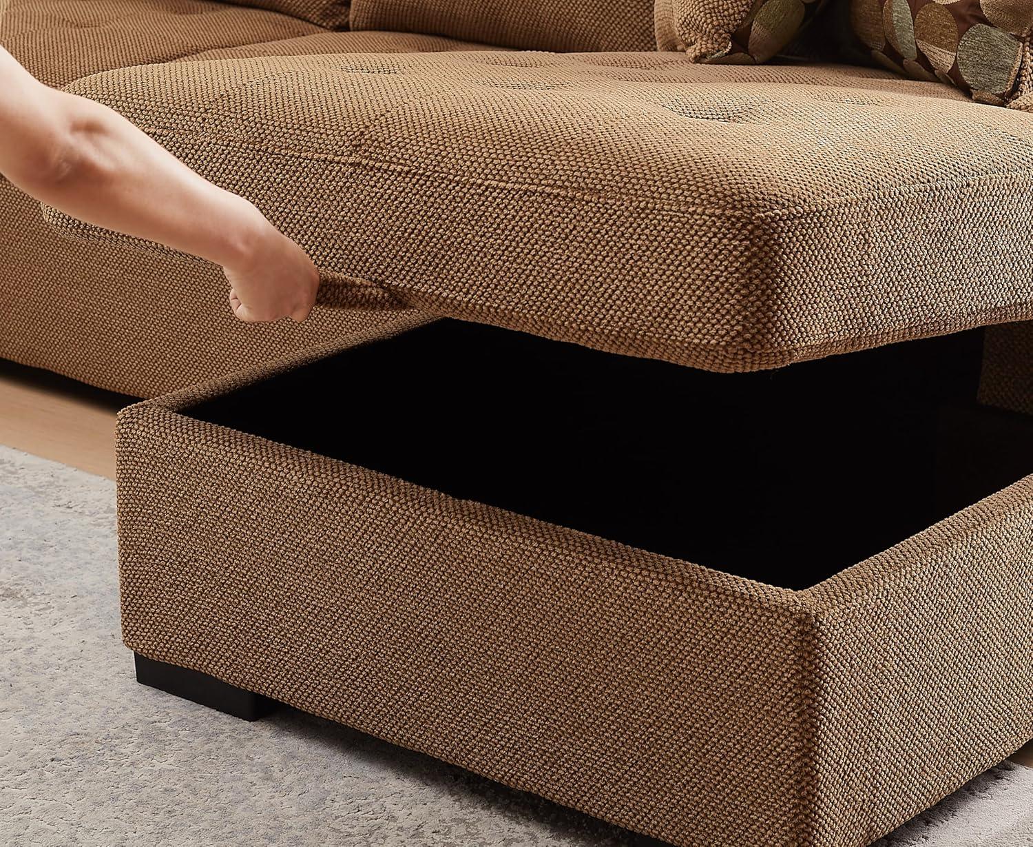 As you position the modules into the U shape, seams and armrests sit into place with a small shift of the pieces — you naturally nudge them flush, tuck in loose fabric, and pull cushion corners forward. The chaise top lifts and settles with a simple motion, revealing an interior that looks lined and compact when opened, and the pull-out portion slides out with a low, mechanical sound that aligns in most cases without much force. Small creases or packing impressions remain along the corners at first; after a few uses the upholstery relaxes and cushions redistribute where you habitually sit.
