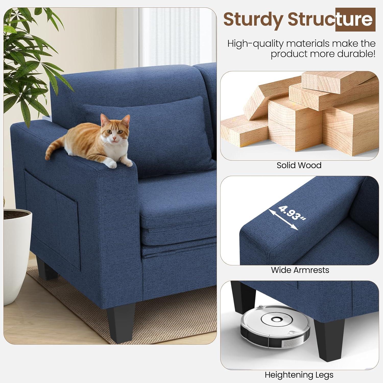 You run your hand across the blue linen and feel the tight, faintly nubbled weave give just enough to tell you it’s springy underneath. Up close the SEJOV 6-in-1 convertible loveseat reads like a compact piece with surprising visual weight—low, broad, and purposeful rather than delicate. The removable backrest is one of those details you find by reaching behind it; it lifts off with a soft thunk and alters the silhouette, while a metal frame tucks away under the seat.Two stitched side pockets already hold the remote and a paperback, and the included pillows sit slightly flattened from use, softening the couch’s geometry. In the room you notice a measured presence: the blue fabric warms with afternoon light and the structure feels quietly solid under your touch.