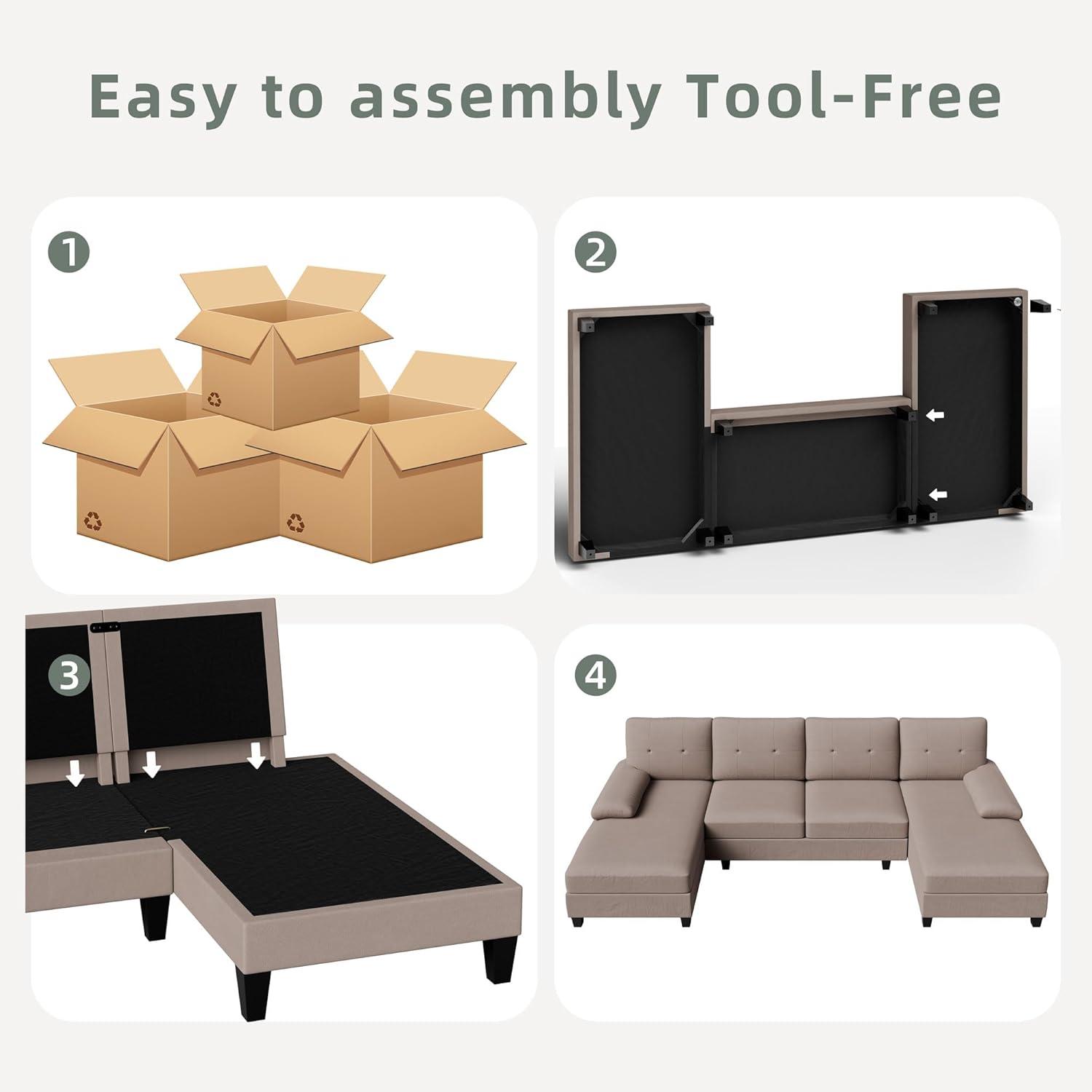 When you first see the beige U-shaped sectional in your living room, it reads as a grounded presence. The U-plan funnels attention inward: from across the room you notice broad,horizontal planes—the backrests and chaise surfaces—that make the seating feel like a single,cohesive form rather than separate pieces. The linen weave softens those planes; under different light it can look warm and muted or a touch chalky, so the same sofa will register slightly differently at various times of day.