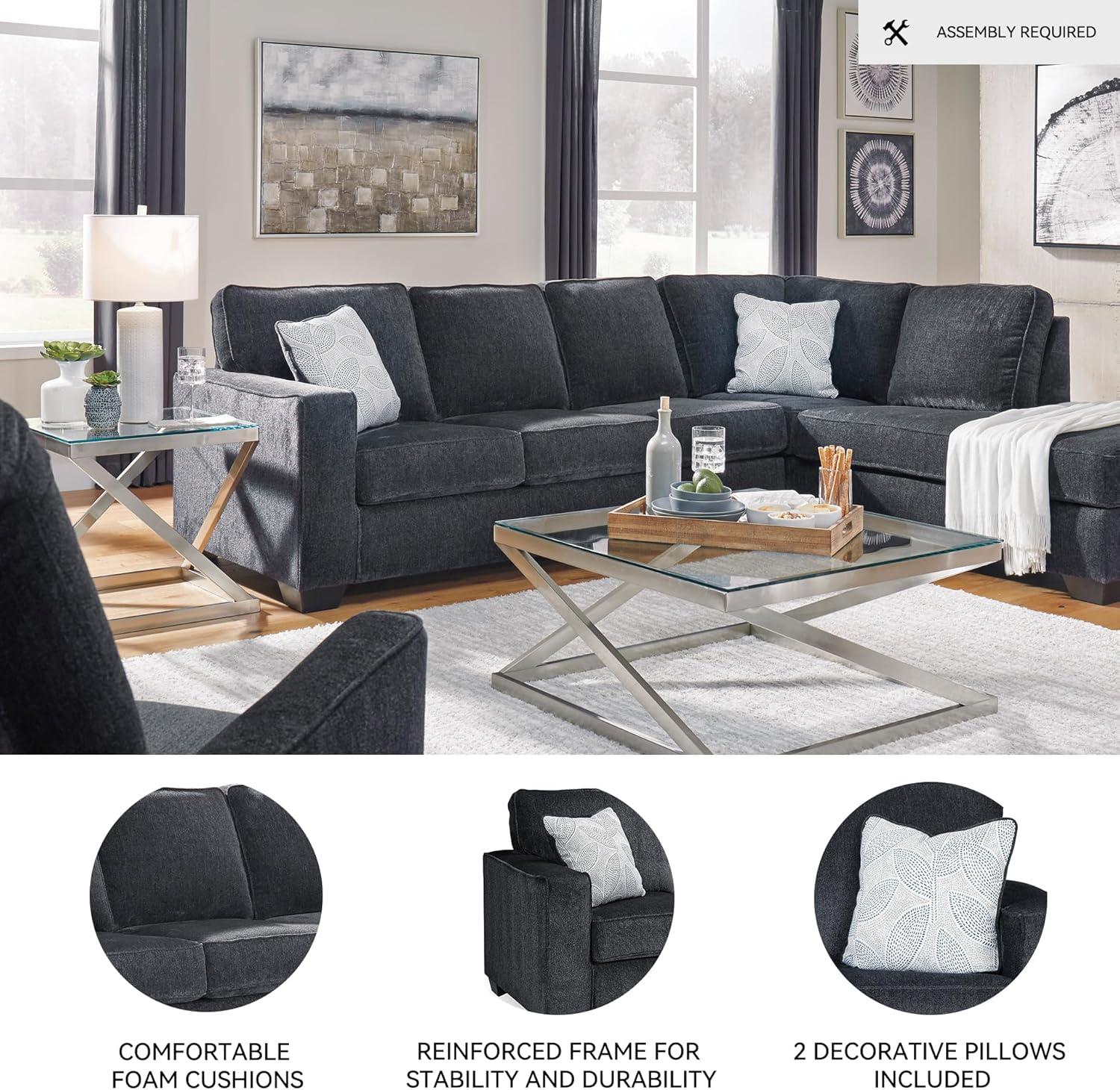 You walk‍ into teh room‍ and the piece instantly reads‌ as ‌a substantial, lived-in‍ presence rather than just another couch. Set up in the corner, the ‍signature Design by Ashley Altari Casual L-Shaped Anti Sag ​2-Piece Sleeper Sectional with Chaise ⁢settles at roughly⁣ 110″ by 90″, its slate-gray, chenille-feel polyester‍ catching the light‌ across clean lines and low track arms. Up close ‍you note the loose, plump seat⁢ cushions and exposed faux-wood feet, the⁤ fabric’s soft nap under your⁤ hand, and the way the chaise widens the seating plane. There’s a discreet pull-out full memory foam ‍mattress on a steel‌ frame tucked beneath the cushions,and two floral‍ accent pillows add a quiet pattern contrast—small details that shape ⁢your first impression of scale, material, and tactile character.