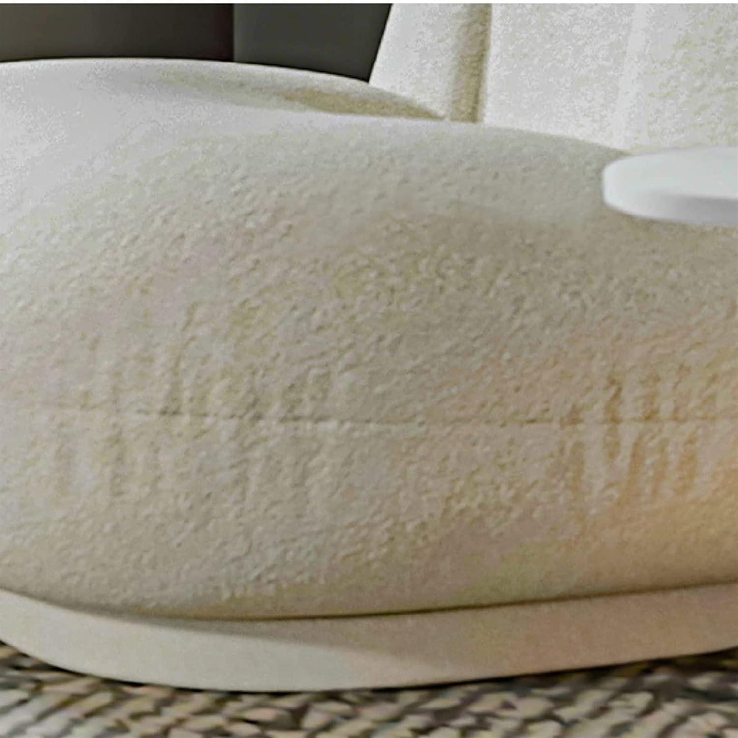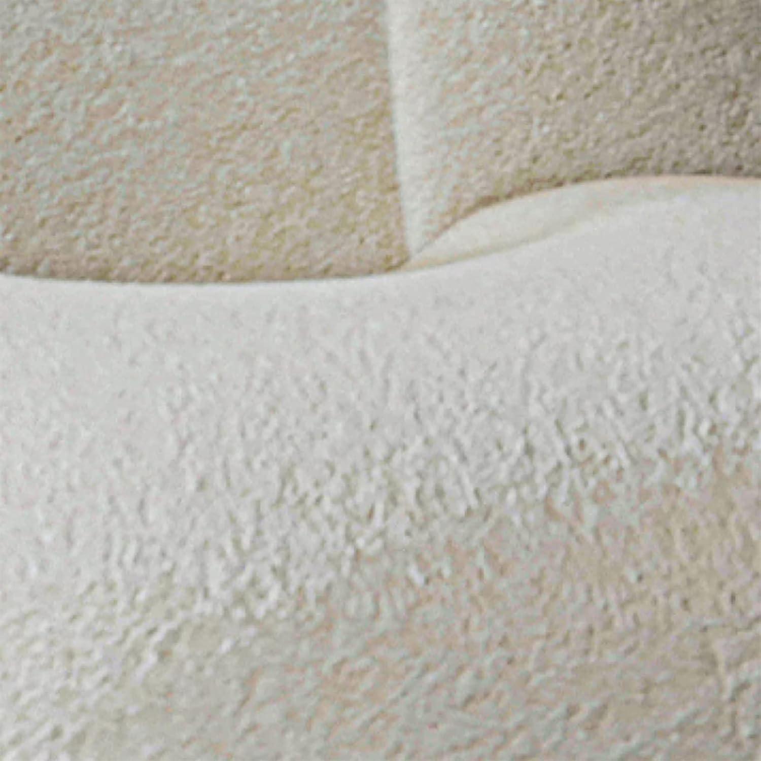 When the piece first arrives and you set it where it will live, the low profile is promptly obvious — it sits close to the floor and reads more like a lounge pad than a conventional armchair. The pale fabric shows light shadows from nearby light sources and can pick up specks against darker flooring; seams and stitch lines become more visible when the cushions settle. Running a hand over the cover reveals a soft nap that flattens slightly where fingers smooth it, and the seat gives under weight then partly springs back as you shift positions.