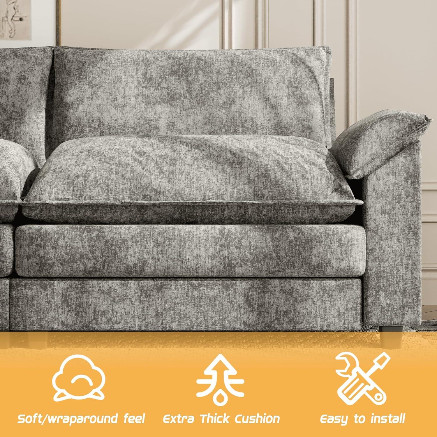 The U shaped setup offers incredible versatility for tailoring our living space to fit both intimate family moments and larger gatherings. Each modular piece can be rearranged effortlessly, transforming the sofa into different shapes like an L-shaped configuration or even separate loveseats. This adaptability means we can customize the seating arrangement depending on the occasion or room layout. Plus, the removable ottoman further enhances flexibility, serving as additional seating, a footrest, or a casual coffee table when needed. The chenille fabric not only adds a touch of elegance but also makes every section cozy and inviting.