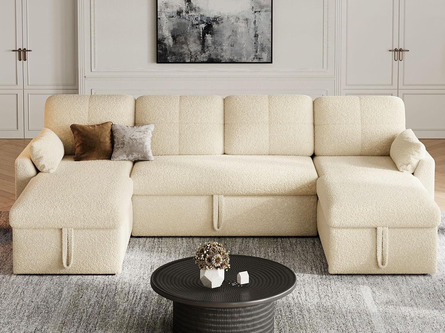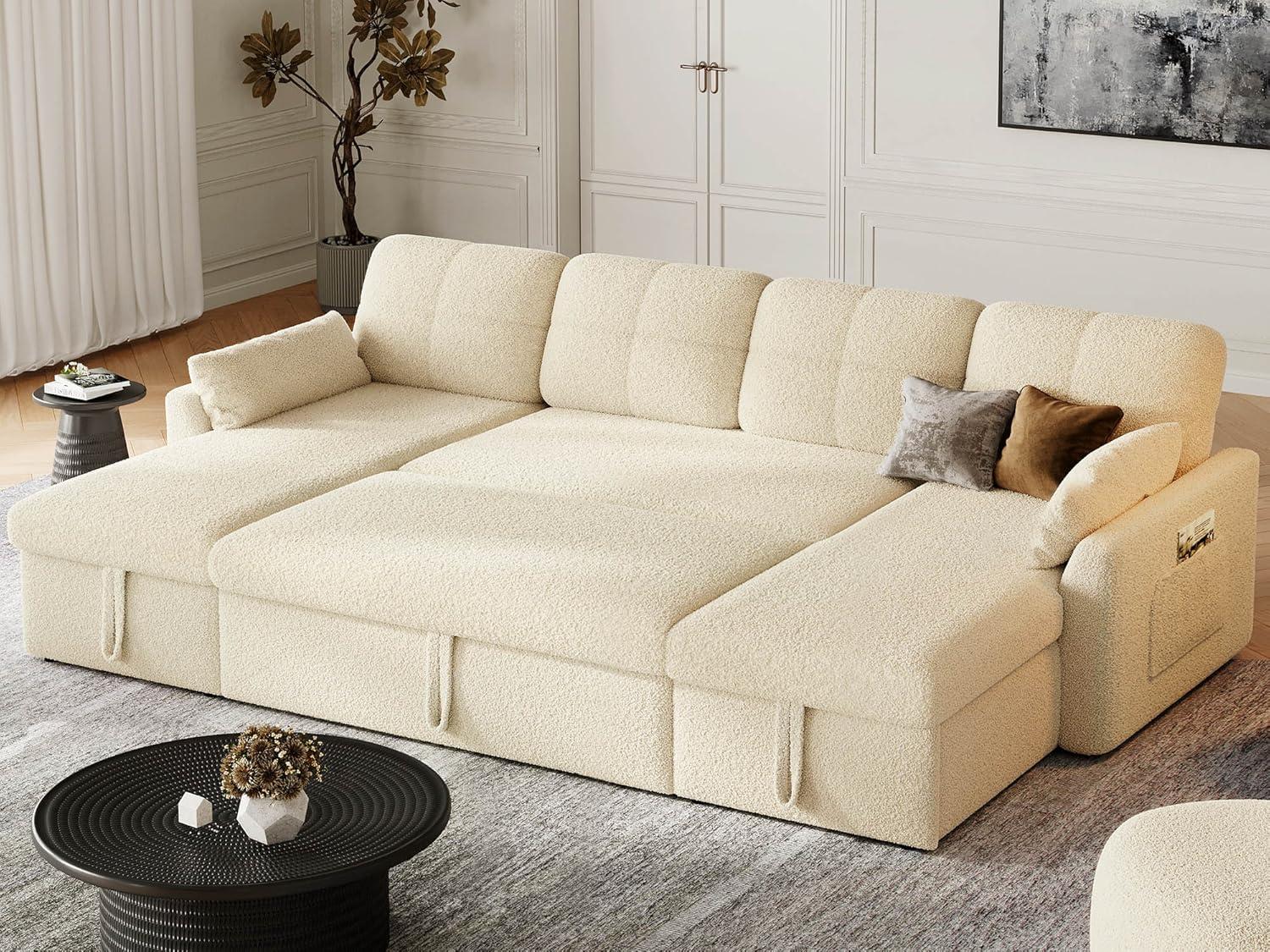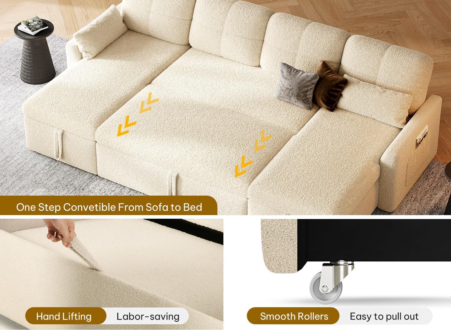 after spending considerable time with this sleeper sofa, we can confidently say it strikes a superb balance between functionality and comfort. The 2-in-1 convertible design effortlessly transforms the spacious U-shaped sectional into a cozy king-size bed, making it ideal for both lounging and overnight guests.The thickened, high-rebound cushions provide excellent support, relieving pressure and encouraging better posture whether sitting or sleeping. One of the standout features for us has been the chaise with generous hidden storage, which keeps our living space neat by housing pillows, quilts, and even magazines or tablets in the convenient side pockets. The teddy fleece upholstery truly adds a tactile luxury, offering a soft, breathable, and durable surface that stands up well to daily use and still feels inviting.