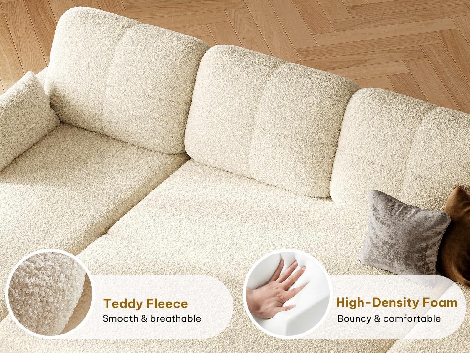 this piece brilliantly combines comfort and versatility, effortlessly serving as both a stylish U-shaped sectional sofa and a spacious king-size bed with a simple pull-out mechanism. The clever design maximizes living space without compromising on style or functionality,making it ideal for both relaxation and overnight guests. Covered in soft, skin-amiable teddy fleece, it provides a cozy yet durable surface that invites you to sit back or lie down in complete comfort.