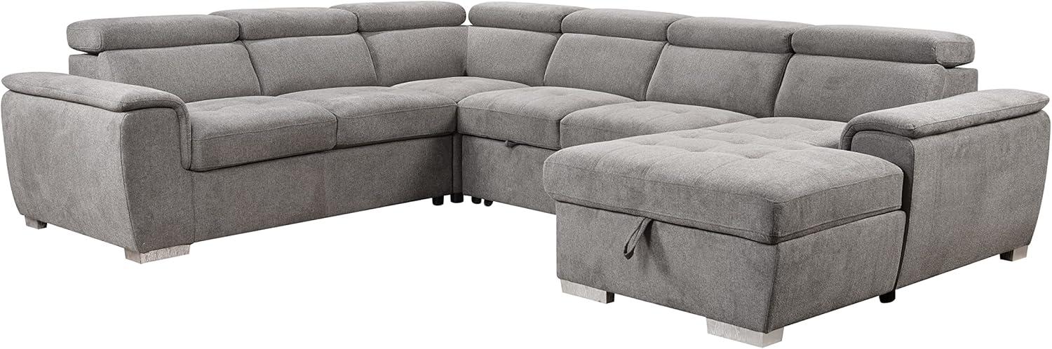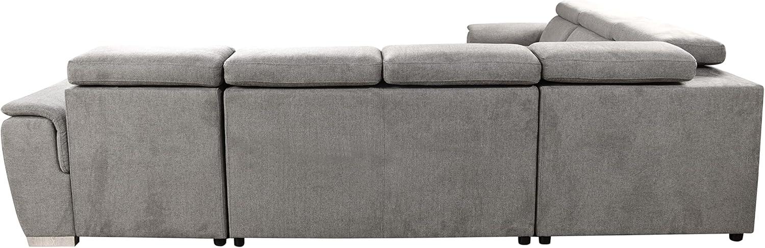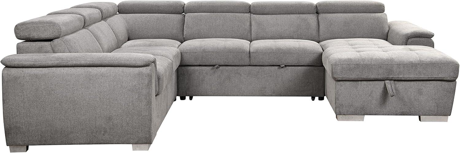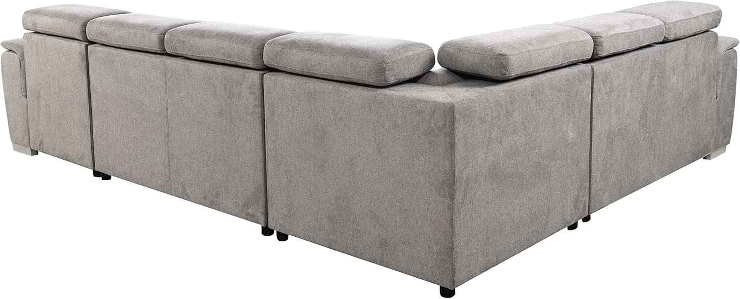This U-shaped sectional sofa redefines comfort and versatility with its spacious seven-seat design and adjustable headrests, making it perfect for large families or social gatherings.Its ergonomic cushioning and sturdy frame provide remarkable support for lounging or entertaining, while the light gray upholstery effortlessly blends with diverse décor styles. Beyond aesthetics, the sectional features a practical pull-out couch bed and a built-in storage chaise, maximizing functionality without sacrificing style.