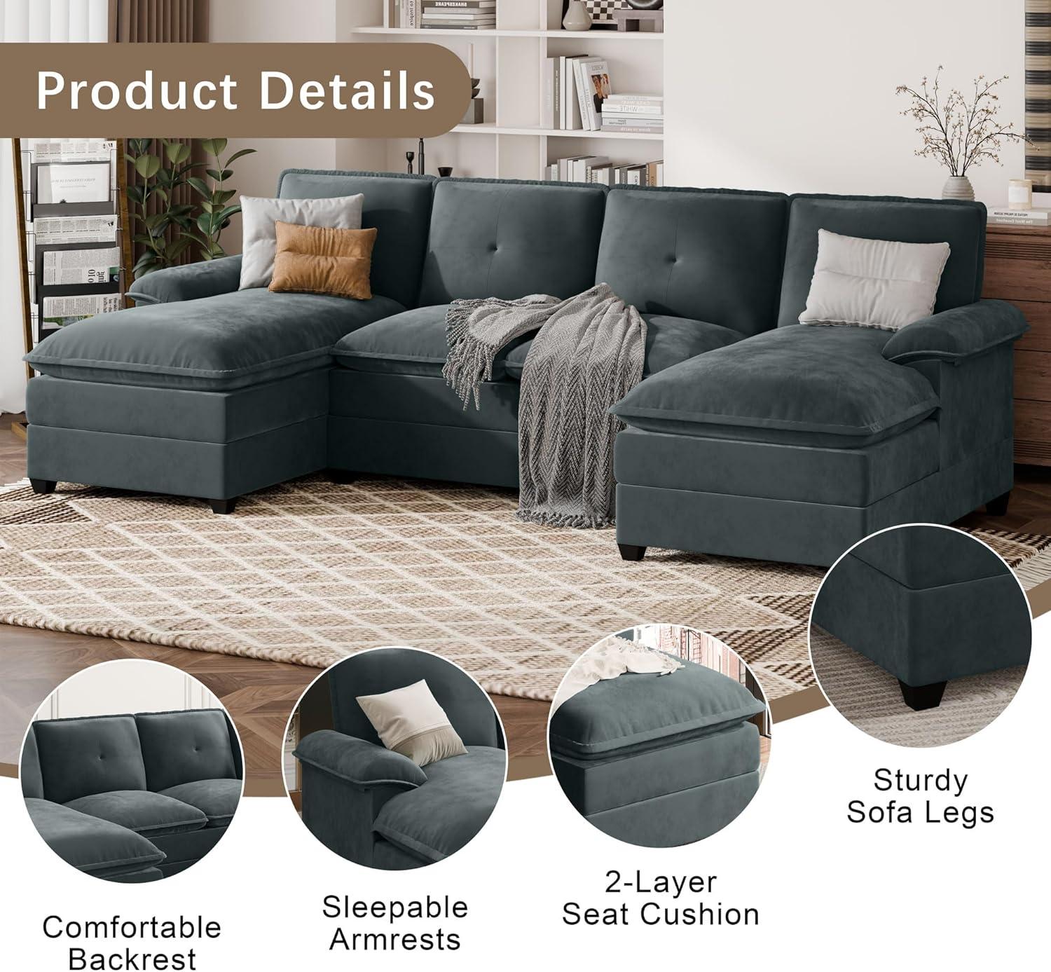 We truly appreciate the cloud-like softness provided by the high-resilience memory foam cushions. Sitting or even napping on this sofa feels inviting and supportive, striking a great balance between plush comfort and structure.The dual chaise lounges add an extra layer of relaxation,giving us the option to stretch out comfortably without crowding the rest of the seating area.Whether we’re watching movies, reading, or just lounging with company, the U-shaped design perfectly wraps around our living space, making it easy for everyone to feel included and cozy.