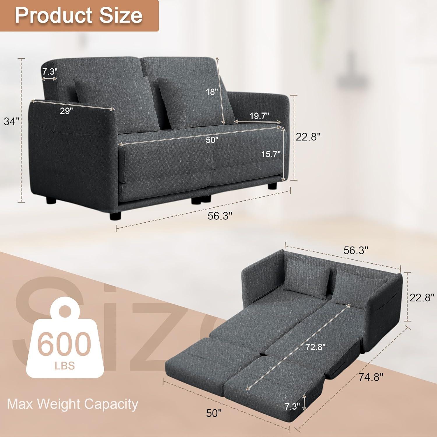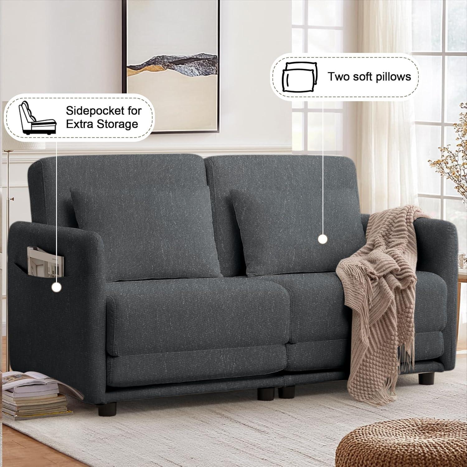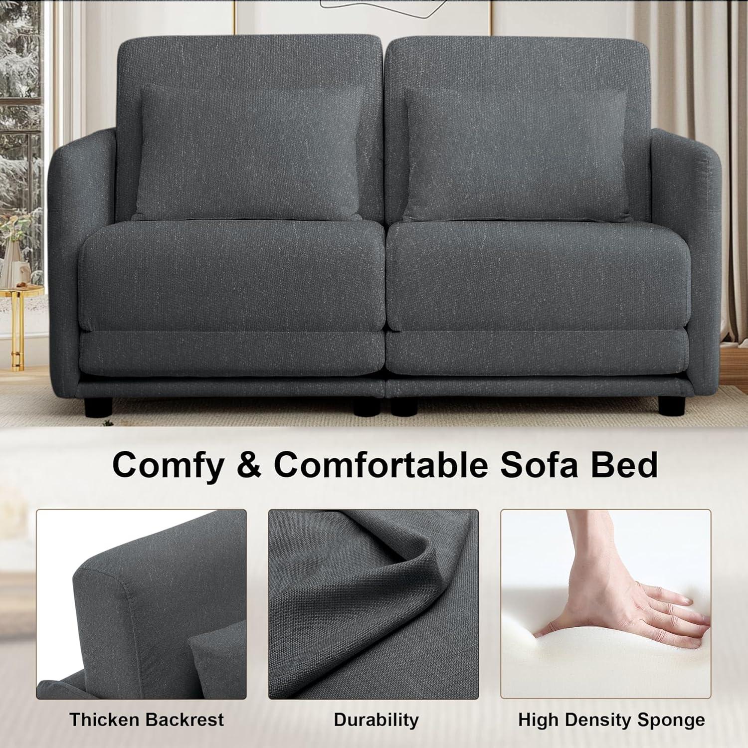 This convertible loveseat brilliantly redefines the conventional sofa bed by combining comfort, functionality, and space-saving design. Unlike standard pull-out couches,it transforms seamlessly into a floor-level bed equipped with a 7.3-inch soft mattress layered beneath a 15.7-inch thick sponge seat cushion. The included pillows add an extra touch of coziness, perfect for relaxing, reading, or hosting overnight guests. Its compact footprint makes it ideal for small apartments or guest rooms without compromising on comfort or style.