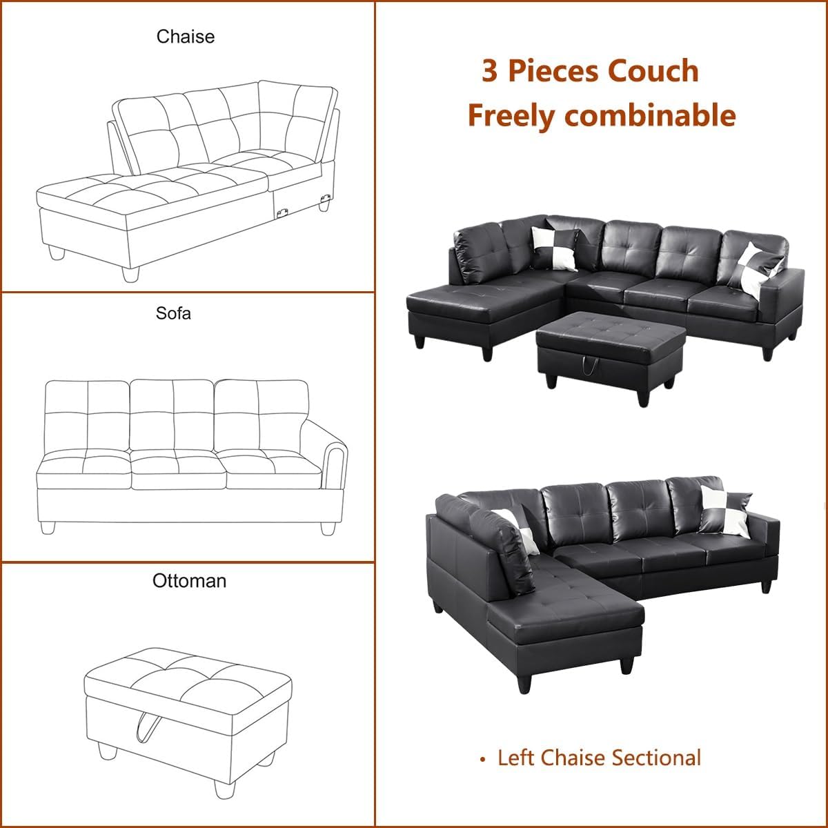 The sectional perfectly balances style and functionality, featuring a sleek modern design that effortlessly complements various living spaces. Crafted with premium semi PU synthetic leather and supported by a solid wood frame, it offers both durability and comfort. The left chaise configuration adds an inviting lounge area, ideal for unwinding or entertaining guests. Additionally, two toss pillows enhance the cozy atmosphere, while the ottoman provides flexible use as extra seating, a footrest, or hidden storage for blankets and reading materials.