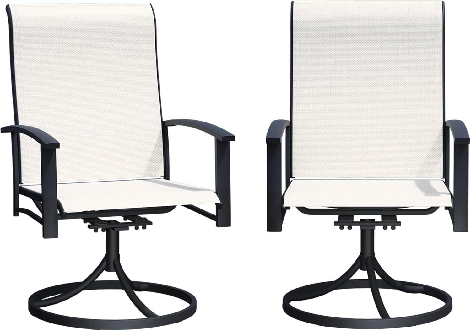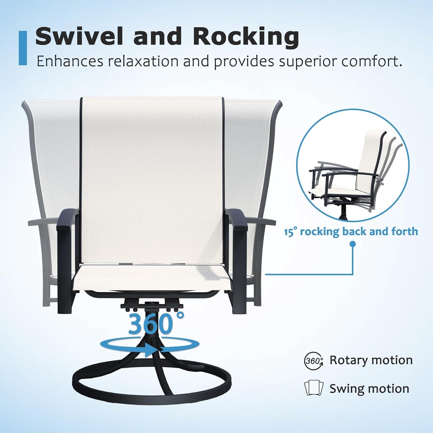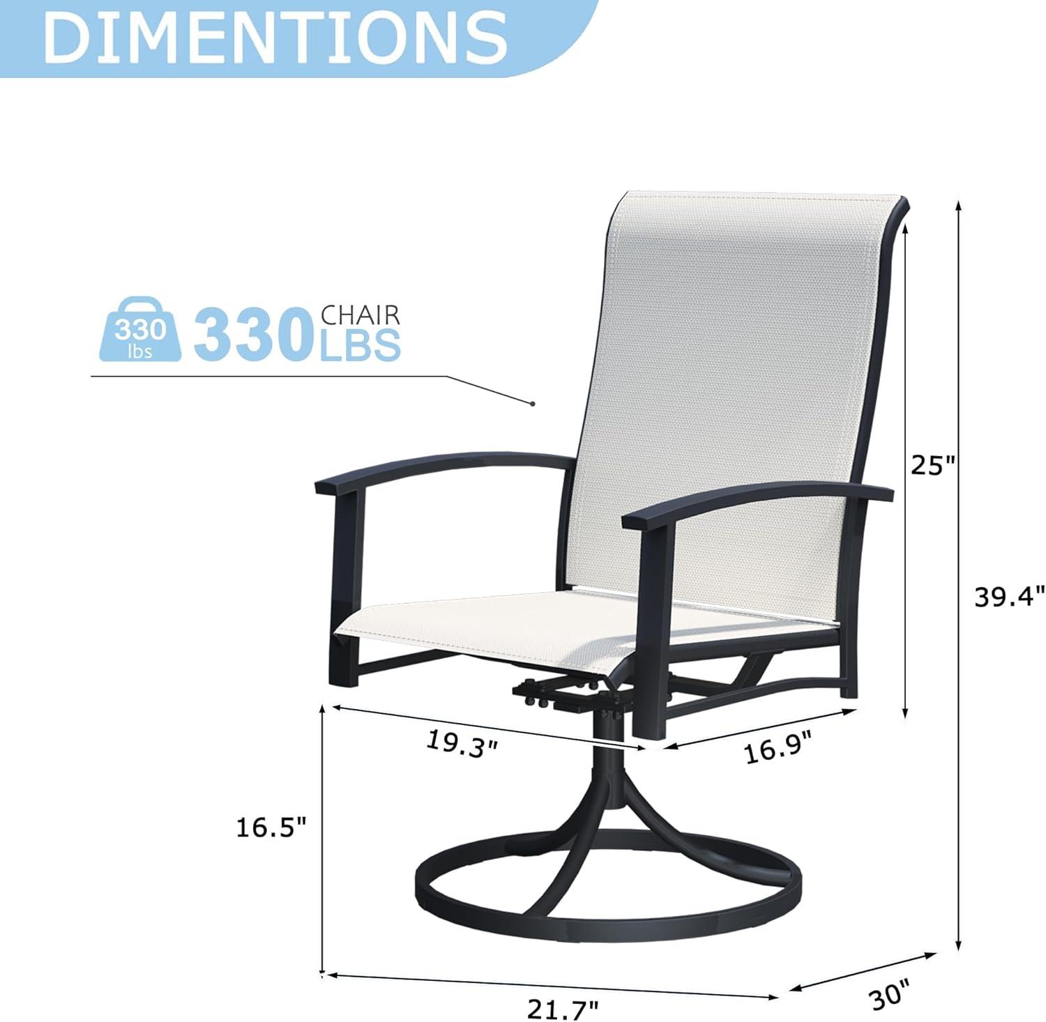 To get the most out of this versatile set, we suggest placing the chairs on stable, level surfaces such as backyard patios, lawn gardens, or wooden decks. Their sturdy metal frame and quick-drying Textilene fabric make them perfect for year-round outdoor enjoyment, even after rain showers. Keep in mind to always assemble the chairs carefully following the instructions provided to ensure safety, especially when using the 360° swivel feature. We recommend avoiding any uneven ground that might increase the risk of tipping or damage.