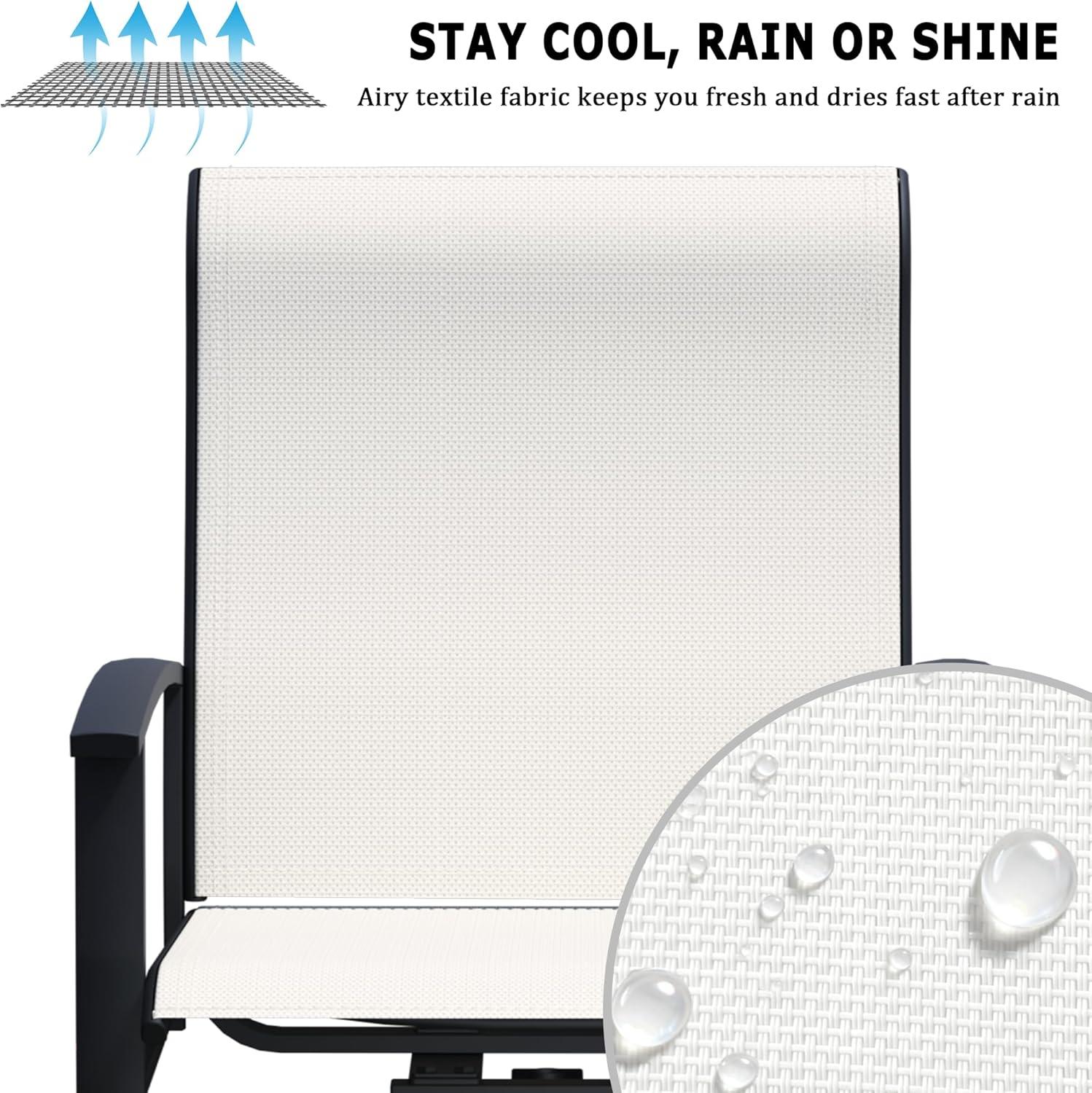 Safety and stability remain paramount with this swivel design. While the chairs offer fluid movement, we always ensure they are placed on a stable, level surface to prevent tipping. The combination of a solid metal frame and quick-drying Textilene fabric maintains durability and comfort even during damp conditions, making these chairs a dependable choice for year-round outdoor use. The ergonomic seat height and cushion size complement the swivel function beautifully, ensuring comfort over extended dining sessions.