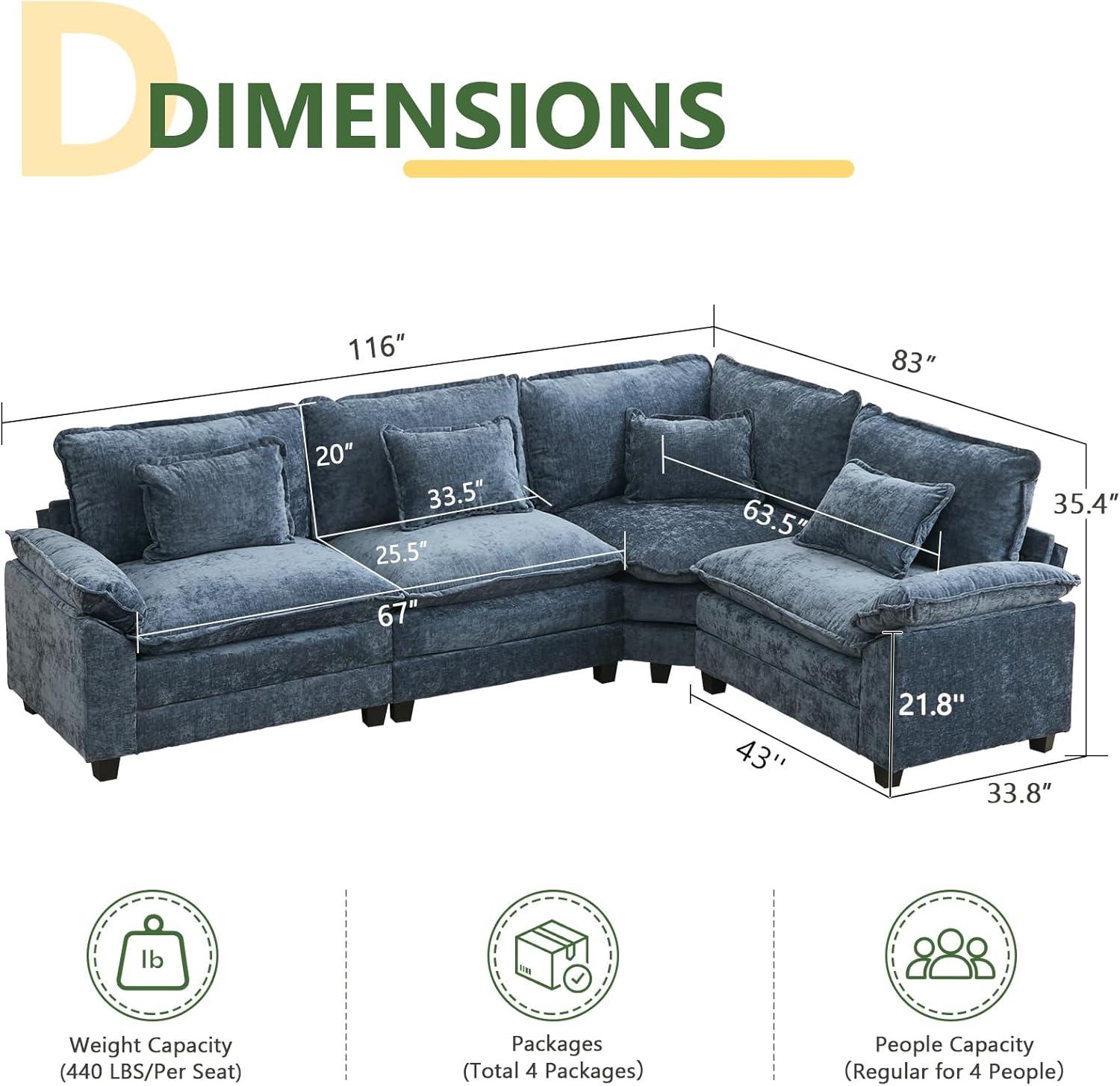This sofa set is an excellent fit for families and social entertainers who need spacious, flexible seating in their living area. Its deep,oversized cushions and plush pillow-armrests make it ideal for lounging,napping,or just unwinding after a long day. Whether you enjoy movie nights with your loved ones or hosting gatherings, the modular design allows you to customize the layout-be it an L-shape for corner placement or a more open, U-shaped setup-to best suit your room and lifestyle. Plus, with sturdy construction supporting up to 440 lbs per seat, it comfortably accommodates a variety of body types without compromising on support or durability.