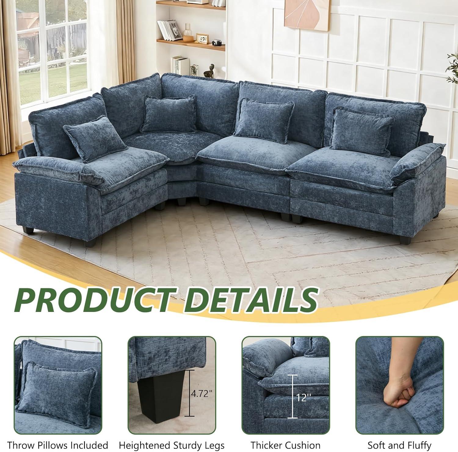 The wide, plush cushions and breathable chenille upholstery not only ensure comfort but also complement our room’s style with a soft blue tone that brightens the area. The included throw pillows enhance back support, making each section ergonomic for different sitting or reclining positions.below is a quick summary of how it blends with our living room setup: