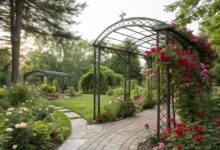 Transform your metal pergola into a vibrant garden oasis by encouraging climbing plants to intertwine with its structure. This natural canopy offers cool shade, wildlife habitat, and a visual feast of greenery.