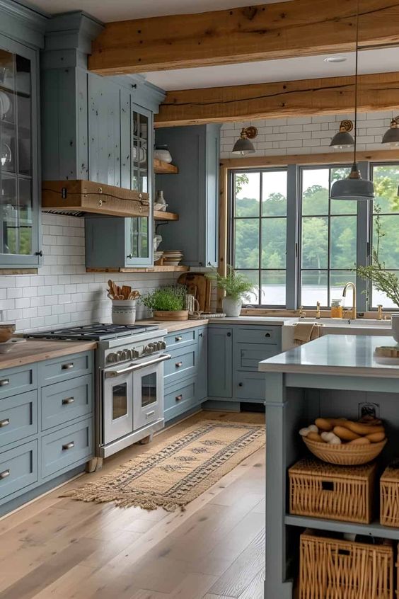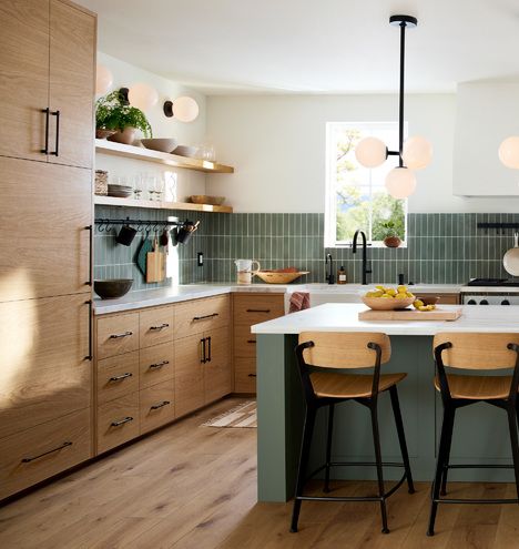 Add open shelving within or alongside your cabinetry system for showcasing artful kitchen accessories or curated collections of dinnerware. This element infuses an open, welcoming ambiance to any kitchen.