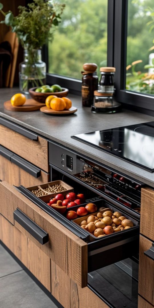 Streamline your kitchen by concealing appliances behind matching cabinet fronts. This technique sustains a uniform appearance and reduces visual distractions, which is ideal for minimalist designs.