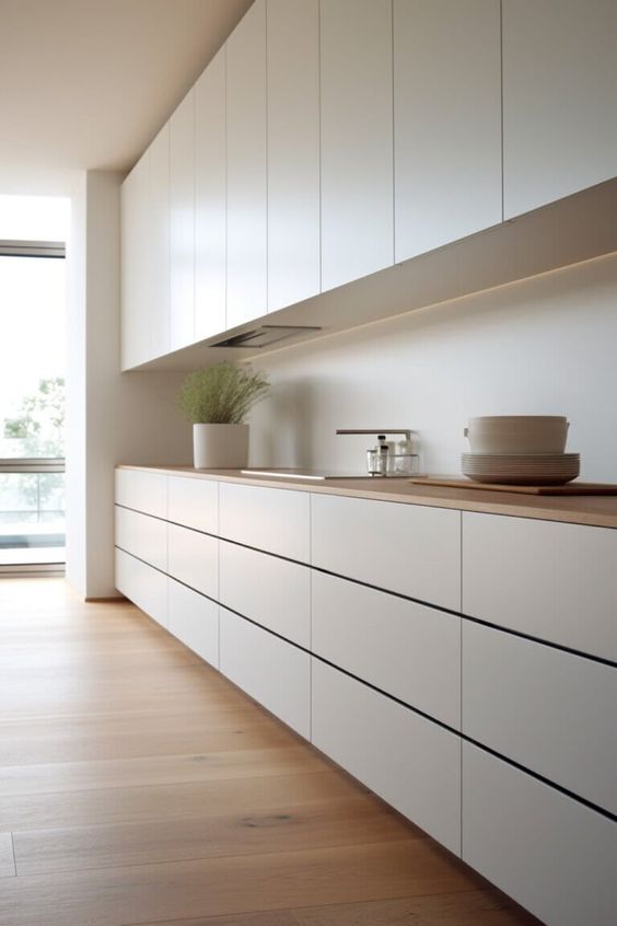 Go for cabinets with integrated grooves or touch-to-open mechanisms instead of traditional handles. This choice supports a clean, cohesive aesthetic and reduces visual clutter in your kitchen space.