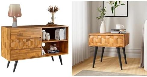 This beautifully crafted nightstand merges rustic charm with modern artistry through intricate geometric detailing that highlights the natural wood grain. Made from premium acacia wood and featuring a sturdy metal leg structure, this piece ensures lasting quality and stability. It comes fully assembled, requiring less than five minutes to set up with clear instructions and included tools. The spacious drawer provides excellent storage, while the large top surface allows you to display your favorite decor items.