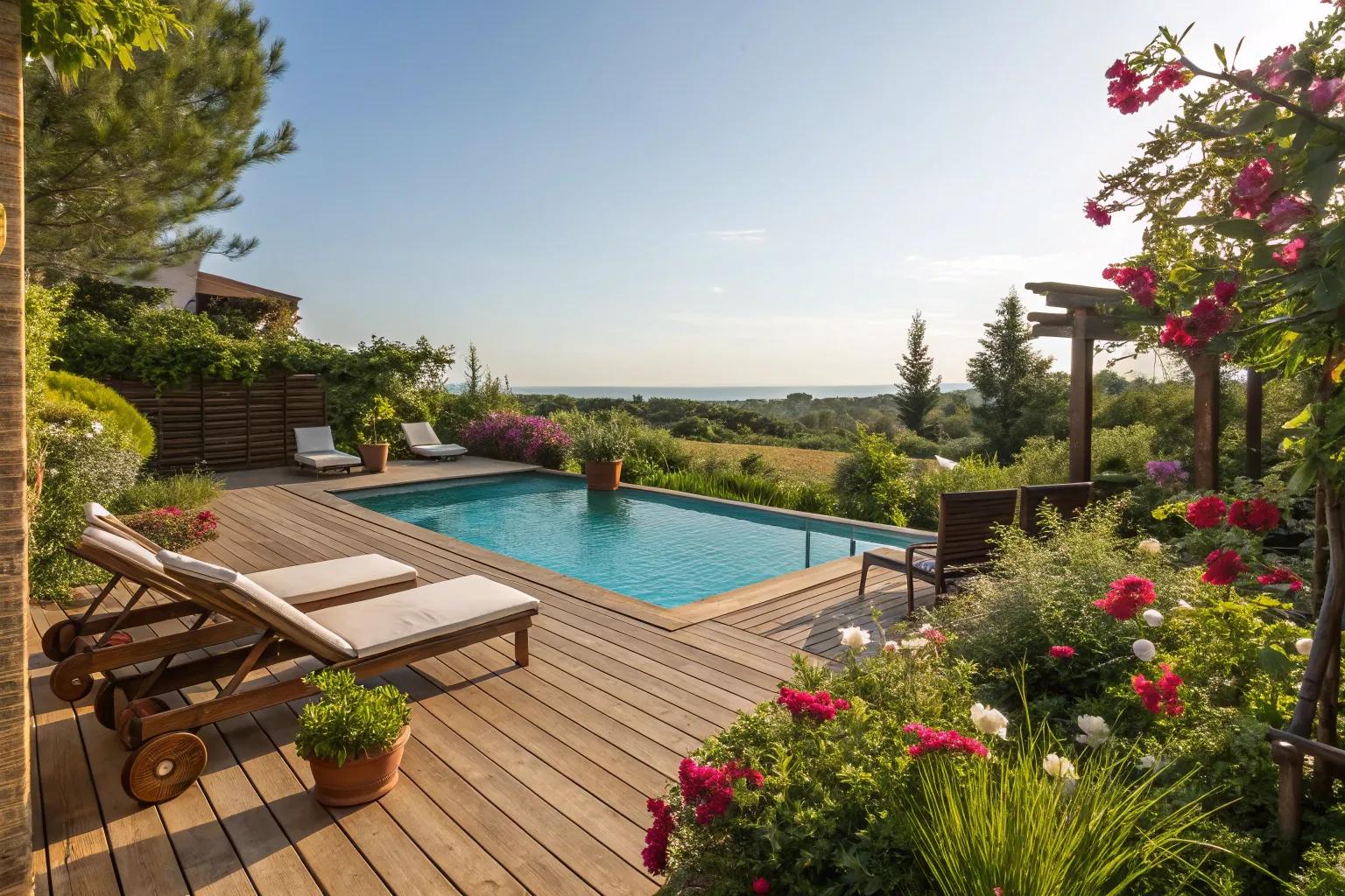 For a softer, rustic poolside vibe, natural pine decking blends beautifully with lush gardens. Its inviting textures make it an ideal choice for creating a soothing, homely spot to unwind during warm days.