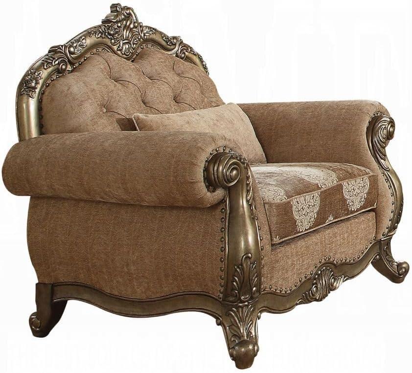 The design of this living room set beautifully bridges timeless tradition with a refined elegance that immediately elevates any space. Each piece features arched scrolled-floral molding trim and a vintage oak finish with antique accents that enrich the overall aesthetic. The button-tufted inside backrests paired with nailhead trim add subtle sophistication, creating a tactile visual interest that feels both plush and classic. The rolled armrests, cabriole legs, and detailed scrolled floral base designs demonstrate masterful craftsmanship, while offering a durable and stable structure thanks to the sturdy wood frame and poly-resin materials.