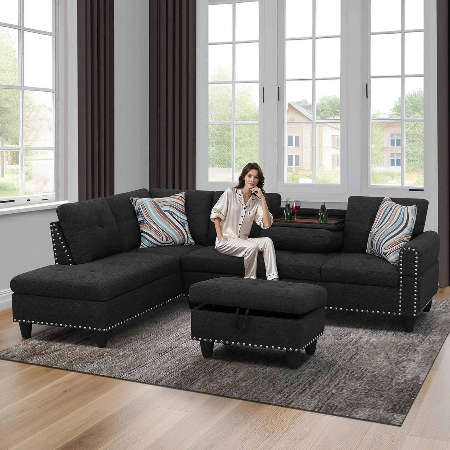 Sectional Sofa Couch, Modern 4-seaters Living Room Furniture Sets with Chaise Lounge, Ottoman & 2 Pillows | L Shape Couch | Cup Holder | Breathable linen Fabric, Charcoal Gray
