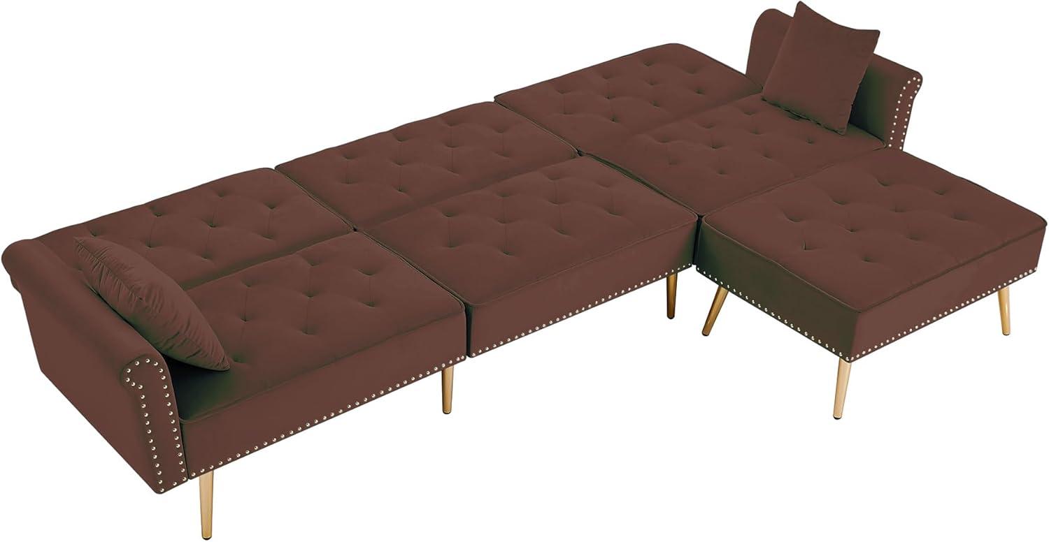 KINFFICT Velvet Futon Sofa Bed with 2 Pillows, Convertible Sleeper Sofa Couch with 3 Angle Adjustable Backrest, Modern Loveseat with 4 Golden Metal Legs for Living Room and Bedroom