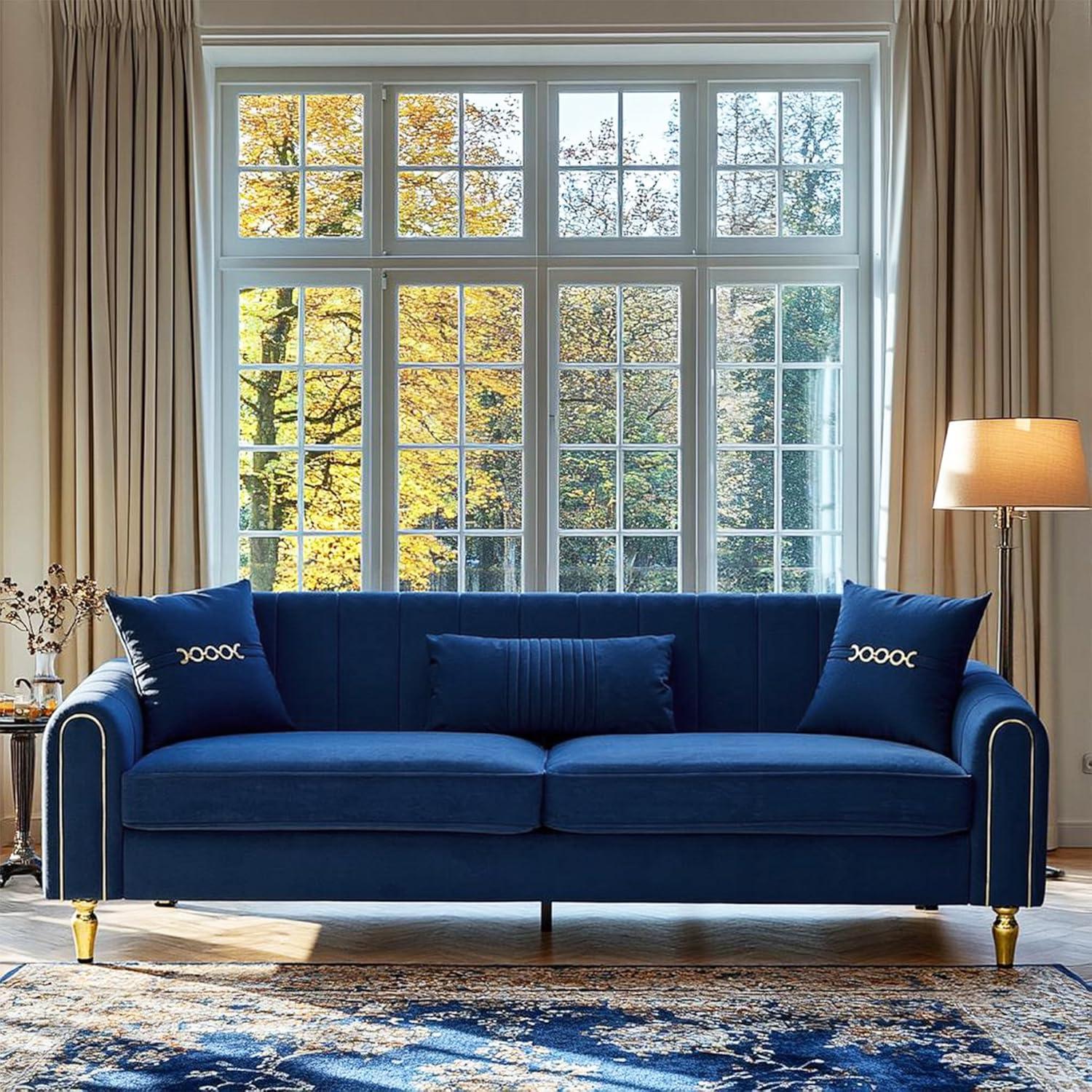 87.5″ Modern 3-Seater Velvet Couch with Metal Legs & Decorative Pillows, High Resilience Sponge Spring Seat, Luxury Sectional Loveseat Sofa for Living Room Apartment Small Space blue