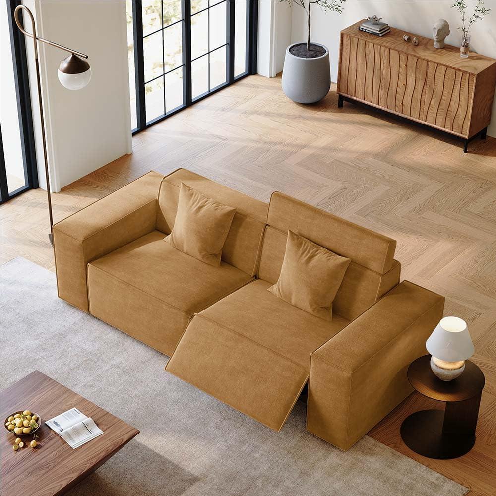 this mid-century modern sofa features smooth electric reclining functionality that easily adjusts between 90° and 135°, allowing you to find the perfect angle for reading, watching TV, or relaxing. Upholstered in a high-quality, scratch-resistant performance fabric, it’s ideal for homes with kids and pets as it wipes clean effortlessly and withstands wear and tear. the seat cushions include plush pillows designed to enhance comfort and ergonomic lumbar support to promote healthy posture during long seating sessions.