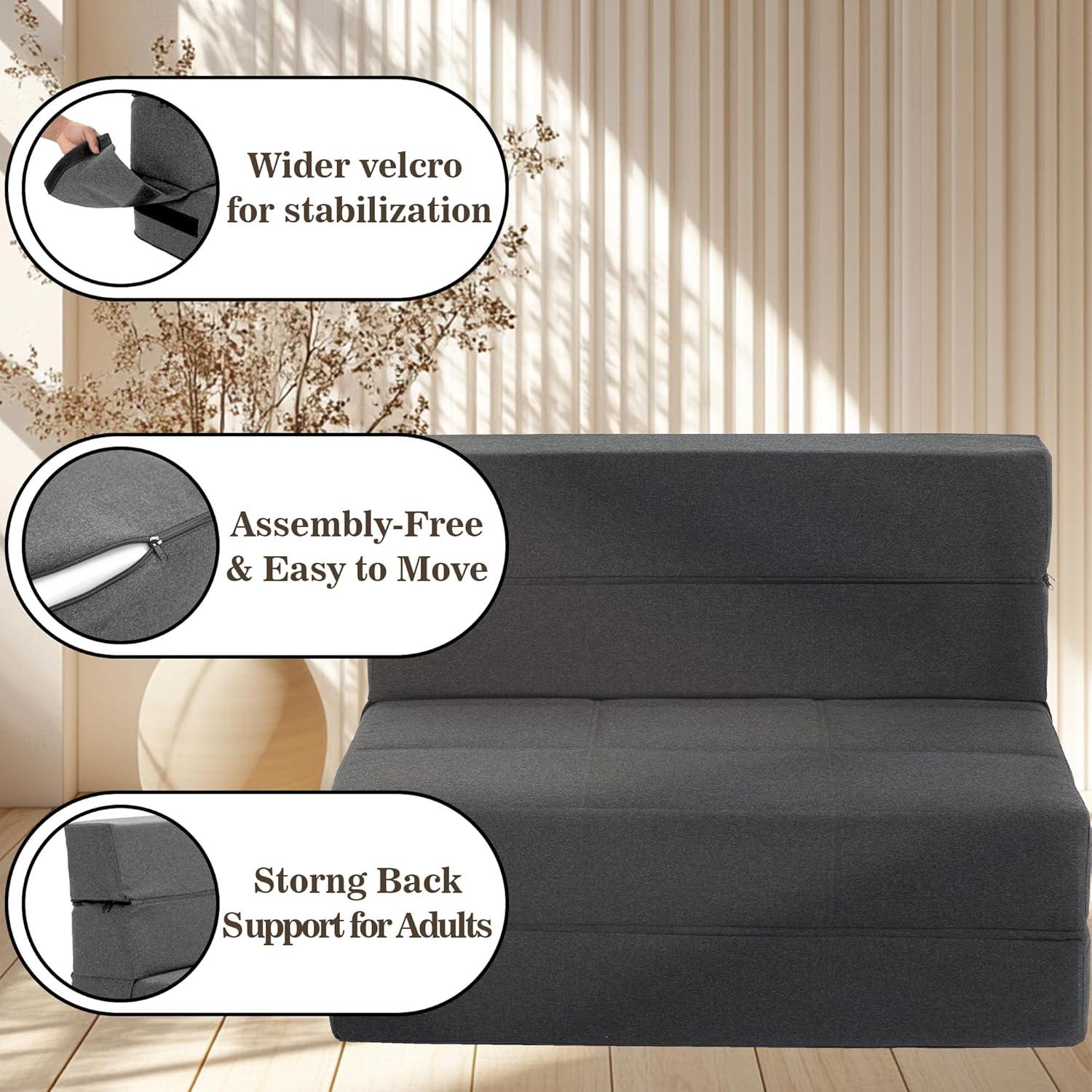 We were immediately impressed by the thoughtful design and sturdy construction of this foldable couch.Crafted with premium fabric and high-density foam that measures 7 inches thick,the comfort level is notable whether sitting or lying down. The linen gray upholstery features a smooth, breathable lambswool surface that feels soft against the skin, making it inviting for long lounging sessions. Additionally, the extended U-shaped zipper adds a practical touch, allowing easy removal of the cover for cleaning-something we truly appreciate in day-to-day use.