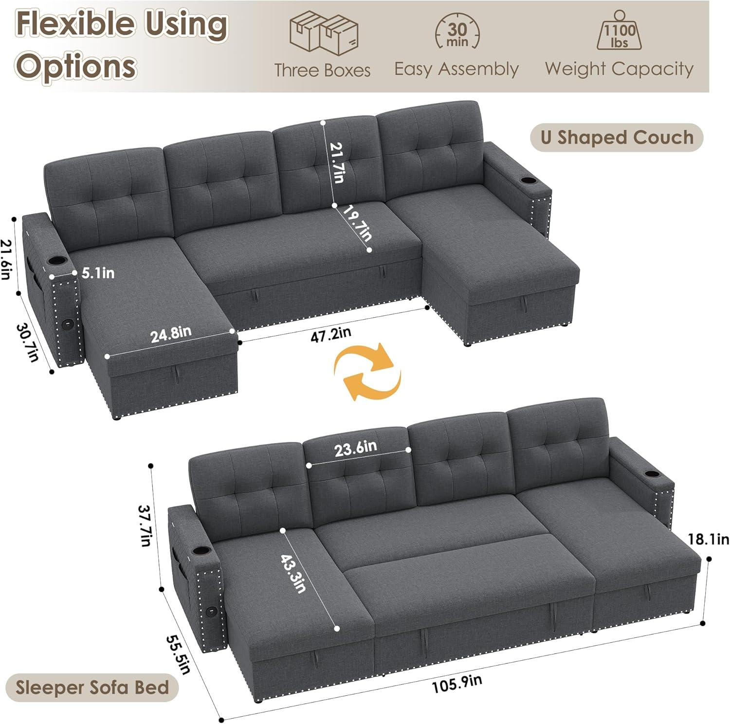 Beyond the bed itself, the multifunctional design shines through with its ample storage options. The spacious compartment under the chaise keeps bedding essentials out of sight but within easy reach, while the storage armrest and side pockets add extra practicality for remotes, magazines, or even your phone. Plus, USB and Type-C ports built into both armrests let us charge devices without leaving the couch, and cupholders make movie nights spill-free and relaxed. The reversible chaise adds layout adaptability to this modern linen sectional, making it truly adaptable to any living space.