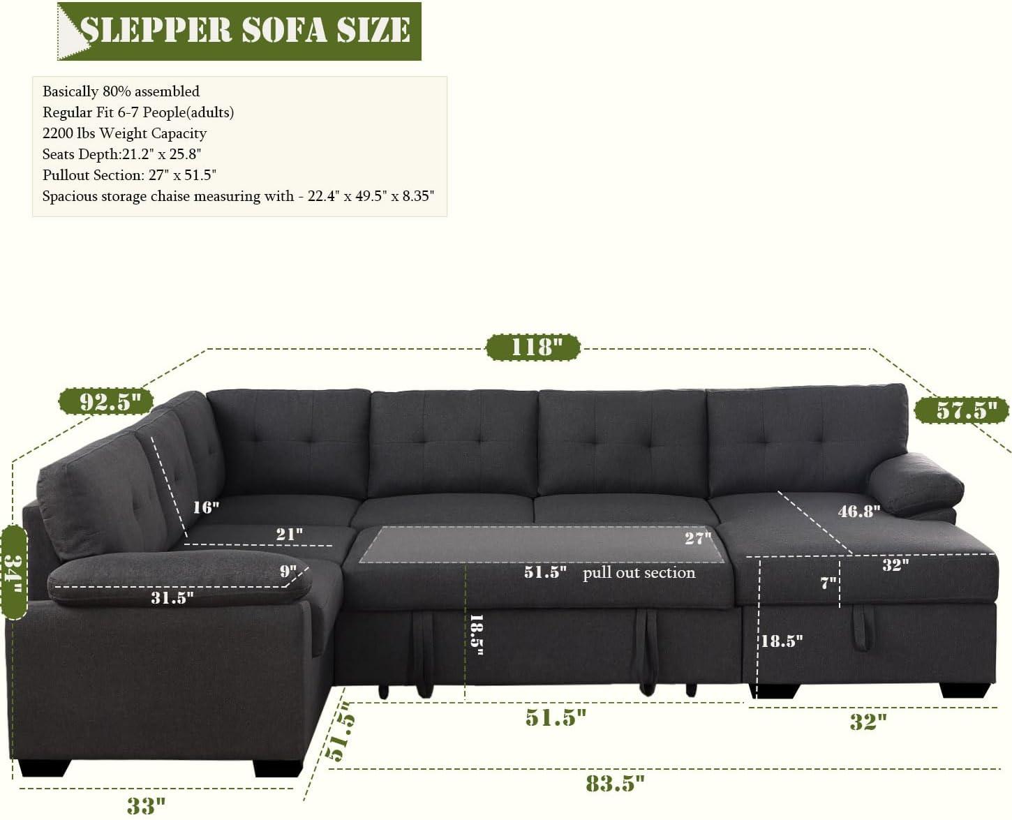 aside from its impressive seating capacity, the sectional sleeper offers a clever pull-out bed mechanism that transforms the sofa into a bed within seconds, ideal for unexpected guests. The chaise lounge also features a spacious hinged storage compartment perfect for stashing away blankets, books, or seasonal items, helping keep the living space neat and clutter-free. Assembly is straightforward with minimal effort required, as most of the sofa comes pre-assembled and includes easy-to-follow instructions for each module piece.
