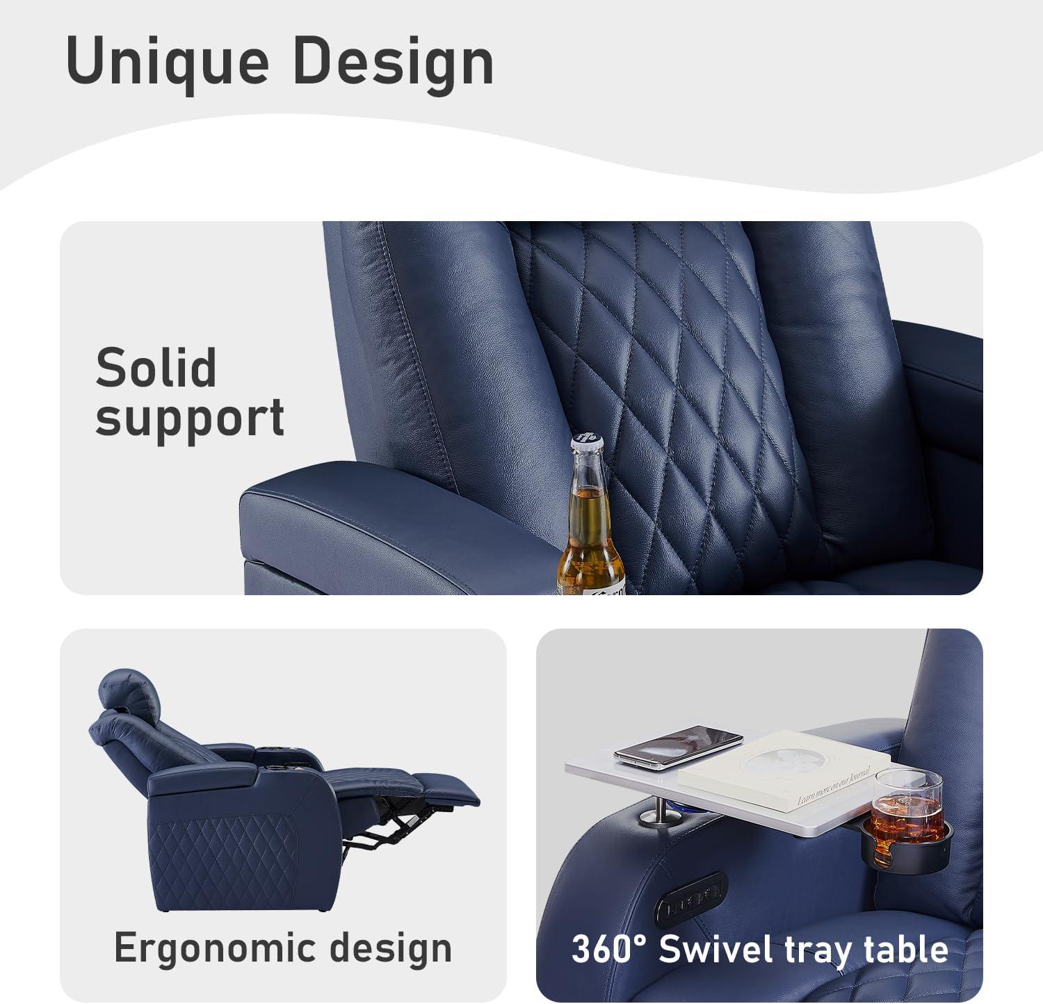 Complementing this tech-savvy design is the thoughtfully included swivel tray table which adds a new level of practical use without sacrificing style.Ideal for snacks, drinks, or even a laptop, the tray pivots smoothly and folds away neatly when not in use, keeping clutter at bay. Coupled with hidden storage compartments for remotes and magazines, and ambient blue LED lighting, this piece creates a cozy, well-organized environment that anticipates our every need. It’s these small yet impactful details that make settling in feel like pure indulgence.
