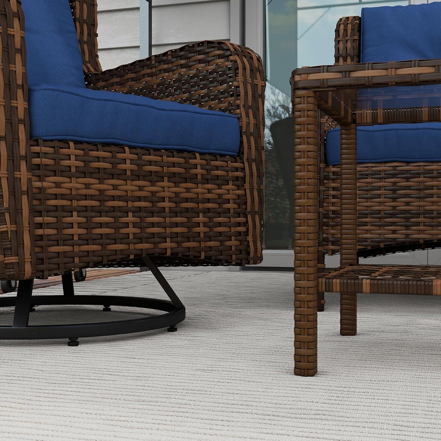 Our experience with this set starts with an gratitude for its carefully crafted aesthetics. The handwoven PE rattan presents a timeless, classic look that blends effortlessly with outdoor environments, from lush gardens to poolside retreats. What stands out is the intricate weaving technique paired with powder-coated steel frames that promise enhanced durability and weather resistance. The tufted cushions feature removable covers, making upkeep straightforward without compromising on comfort. The swivel glider chairs introduce a playful yet practical element, allowing a full 360° rotation paired with smooth gliding motion – perfect for relaxing conversations or casual gatherings.