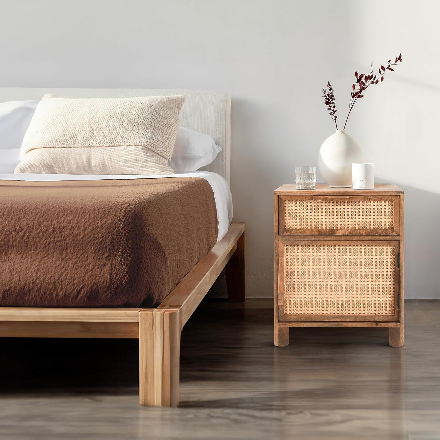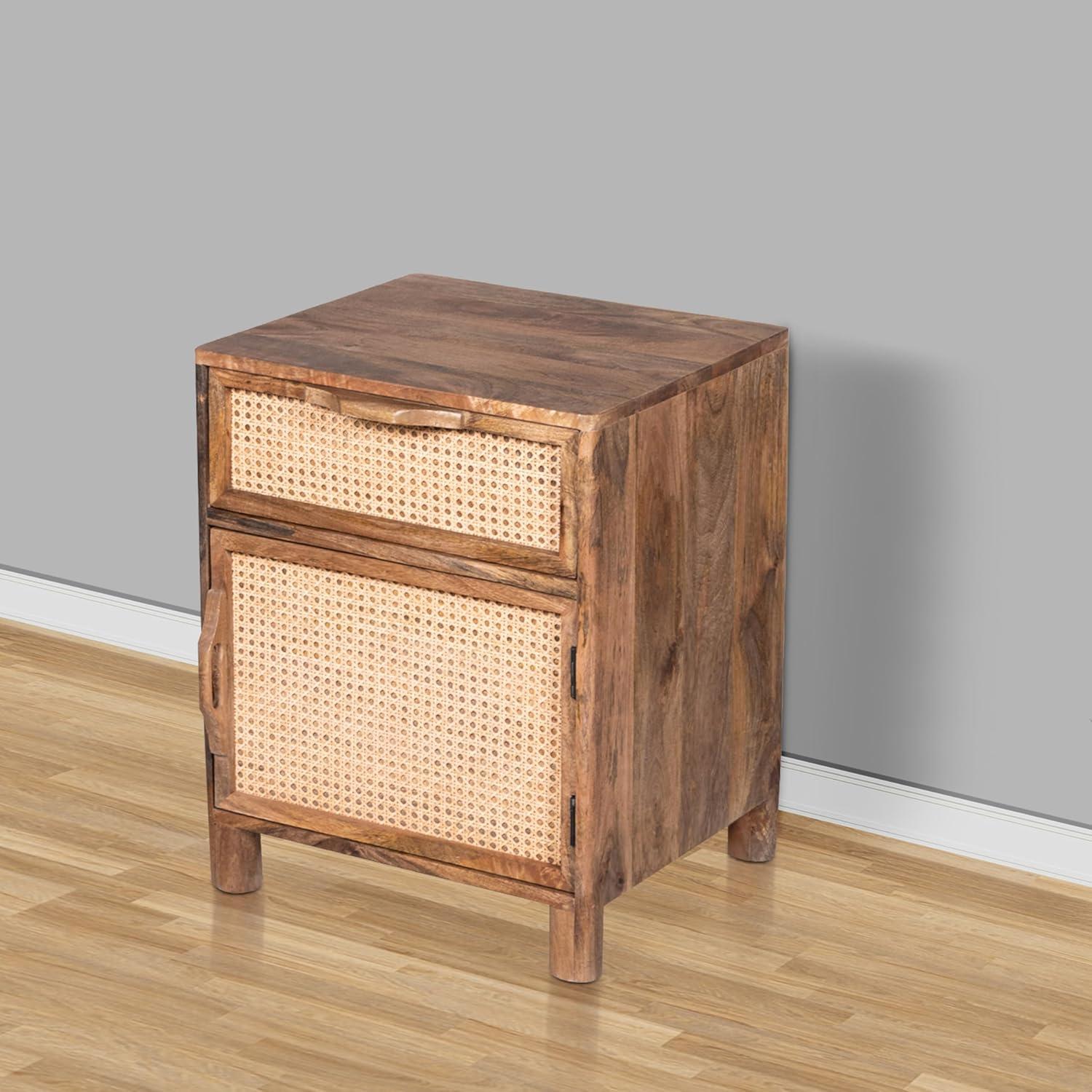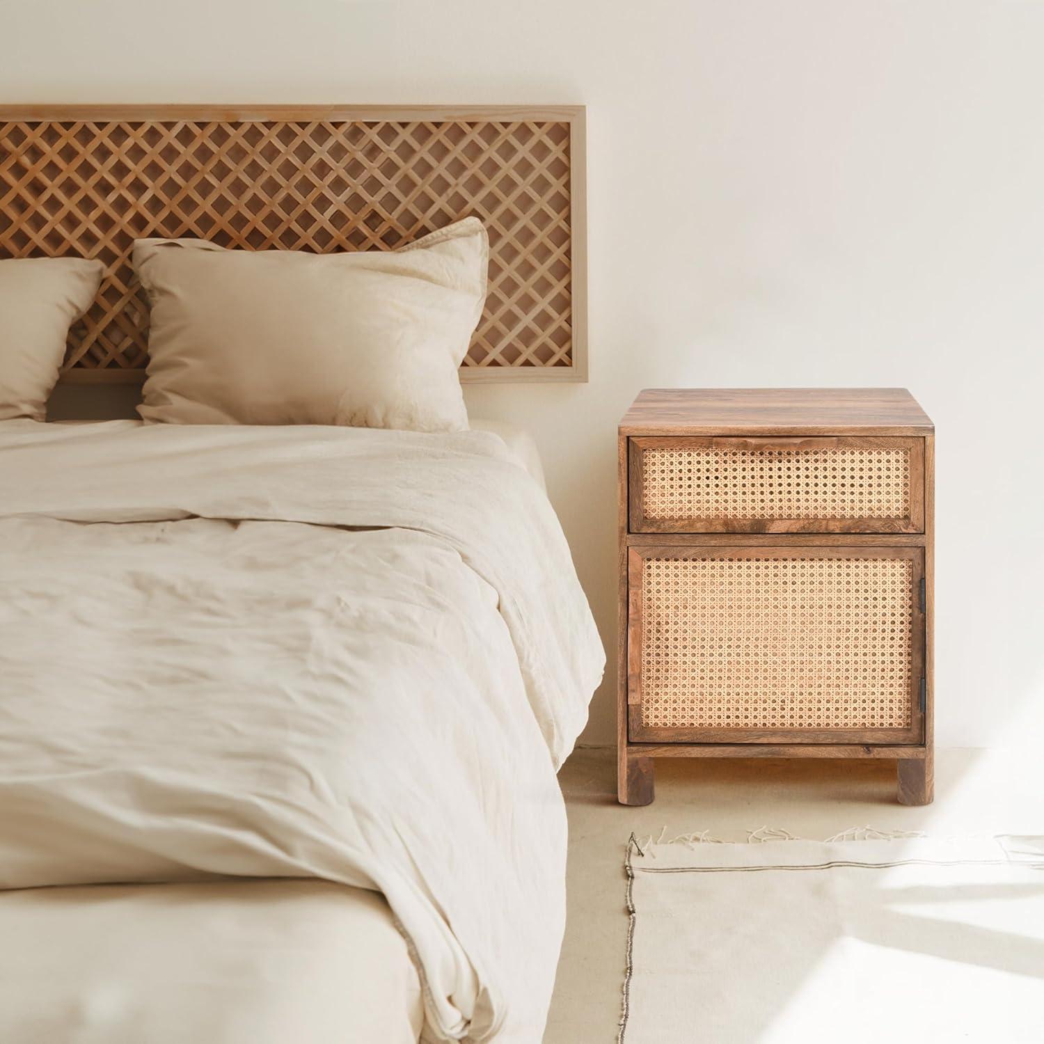 When you place it beside your bed, the piece settles into the room with an easy, unforced presence. Up close the front shows a faint lattice of woven cane that throws a soft, patterned shadow across the cabinet face as light moves through the window; from a few steps back that texture quiets into a warm, tonal panel that breaks the broader wash of wood. The top reads as a modest, usable plane — not commanding, but visually substantial enough to anchor a bedside lamp and a few nighttime essentials without feeling crowded.