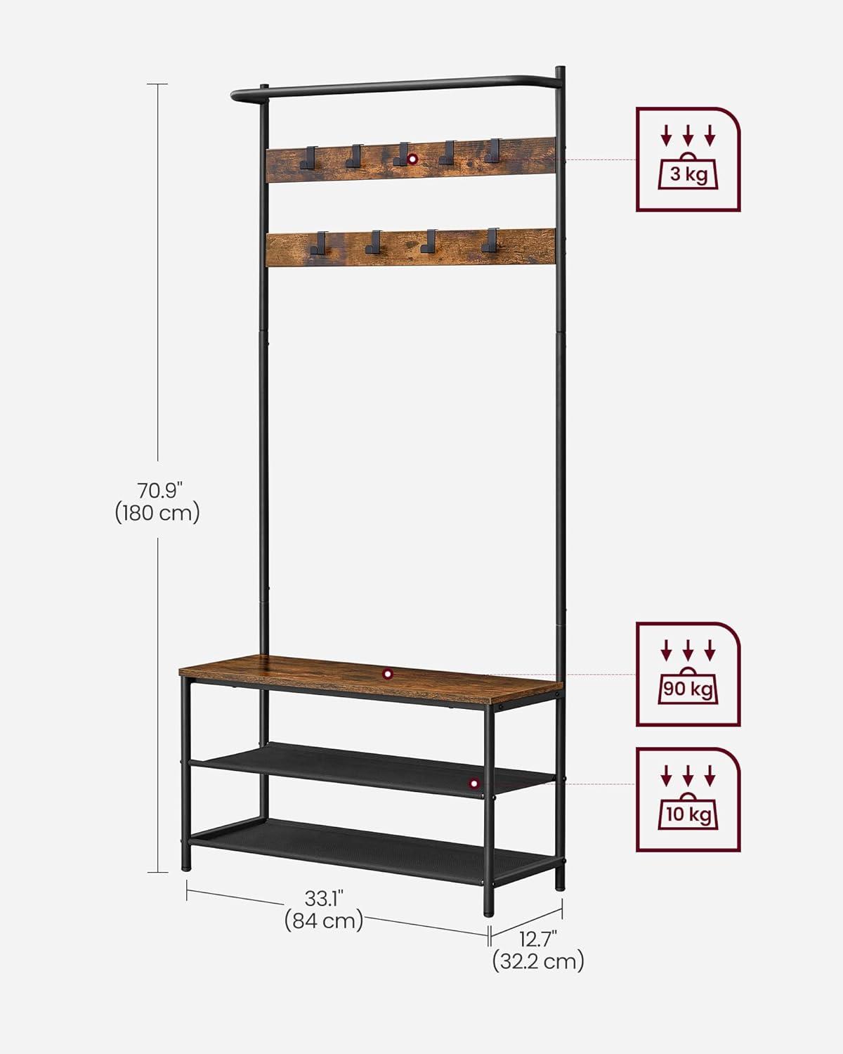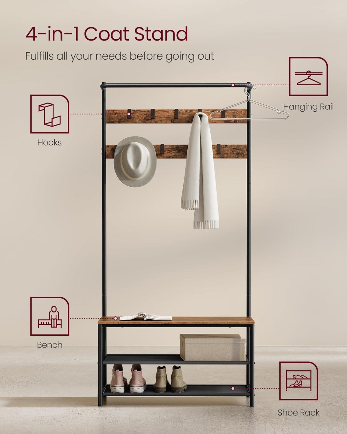 Over time you find the VASAGLE hall Tree with Bench and Shoe Storage, Entryway Bench with Coat Rack Stand and Shoe rack, 9 Movable Hooks, Top Bar, Fabric Shelves, industrial, Rustic Brown and Black UHSR421B01 quietly settling into the entryway, its lines softened by daily use. In regular household rhythms it becomes the place where coats hang for a little while, shoes are shuffled on and off, and small comforts—cushions, an extra scarf—collect in their corners, bringing mild wear that reads like lived-in history. You notice how the bench’s feel changes with habit and the surfaces take on fingerprints and the occasional dust,not suddenly but as the room is used. It stays, part of the room and its steady pace.