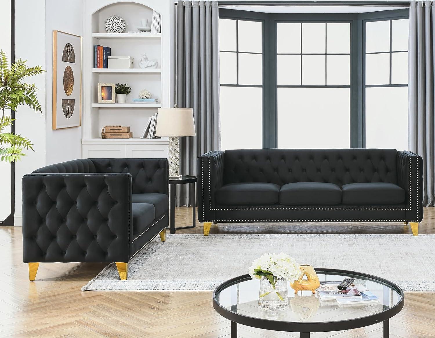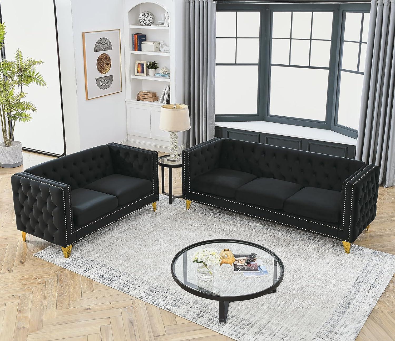 Our time with this sofa set has been quite impressive, combining a modern aesthetic with remarkable comfort. The handpicked velvet upholstery is exceptionally soft and gentle to touch, creating a cozy and inviting seating area. It’s also remarkably durable-resistant to fading and pilling-so it maintains its sleek appearance after daily use. The tufted back and golden rivet accents elevate the overall design, adding a chic and glamorous vibe to our living space. The metal legs not only provide stability but also introduce a stylish contrast that brightens the room with a subtle shimmer.