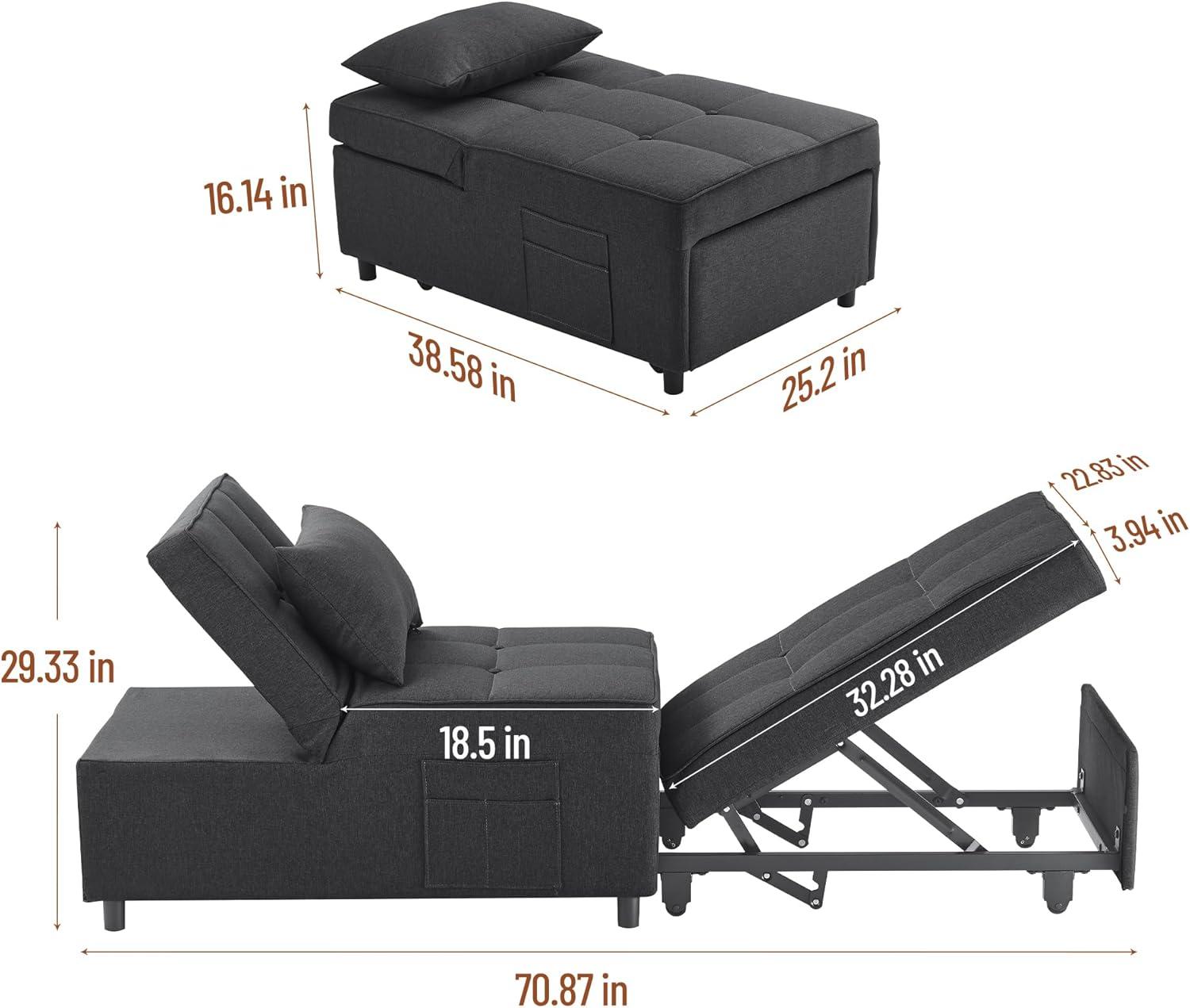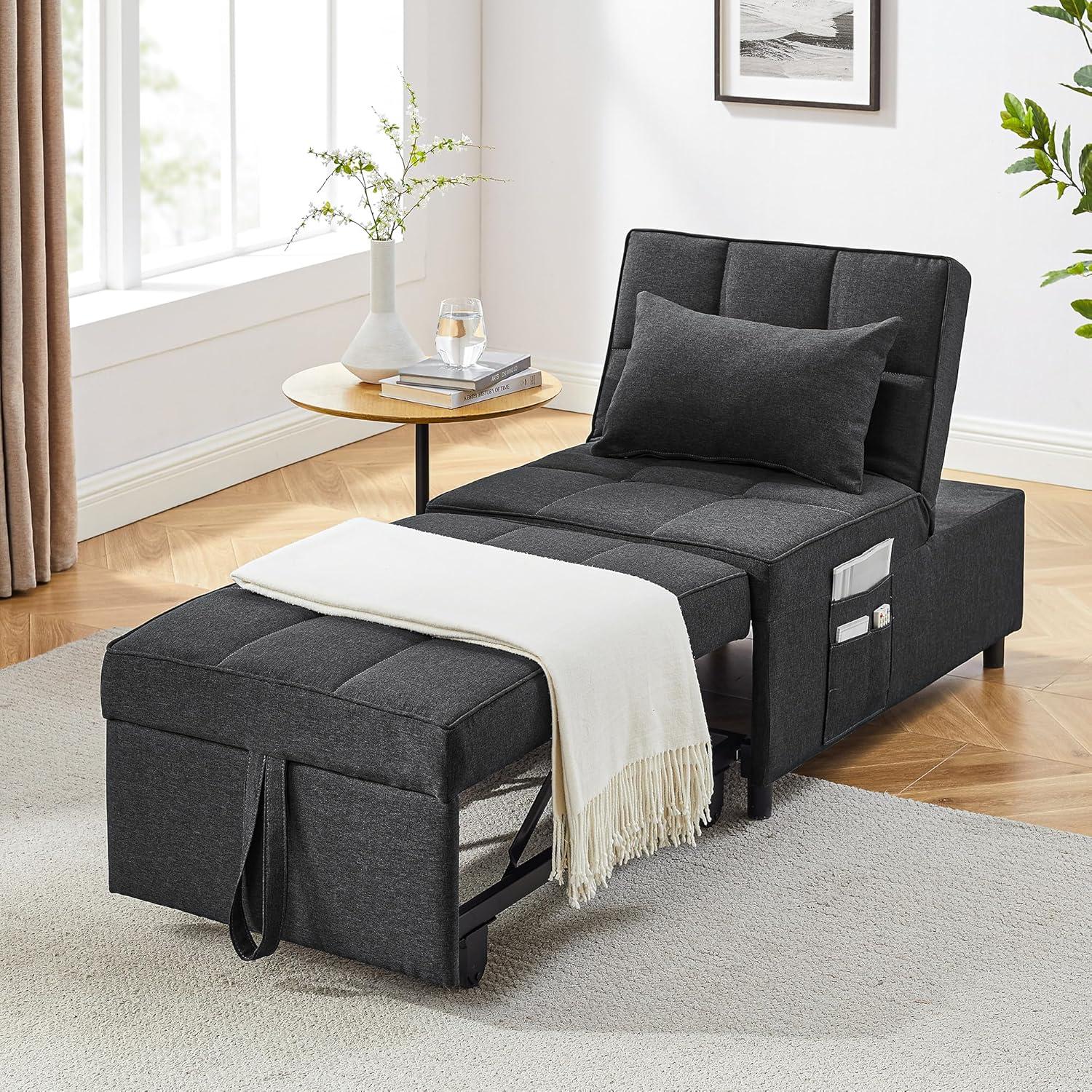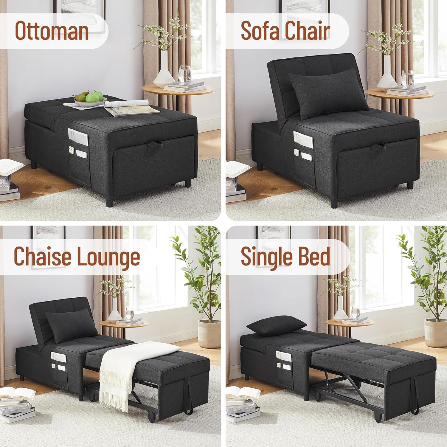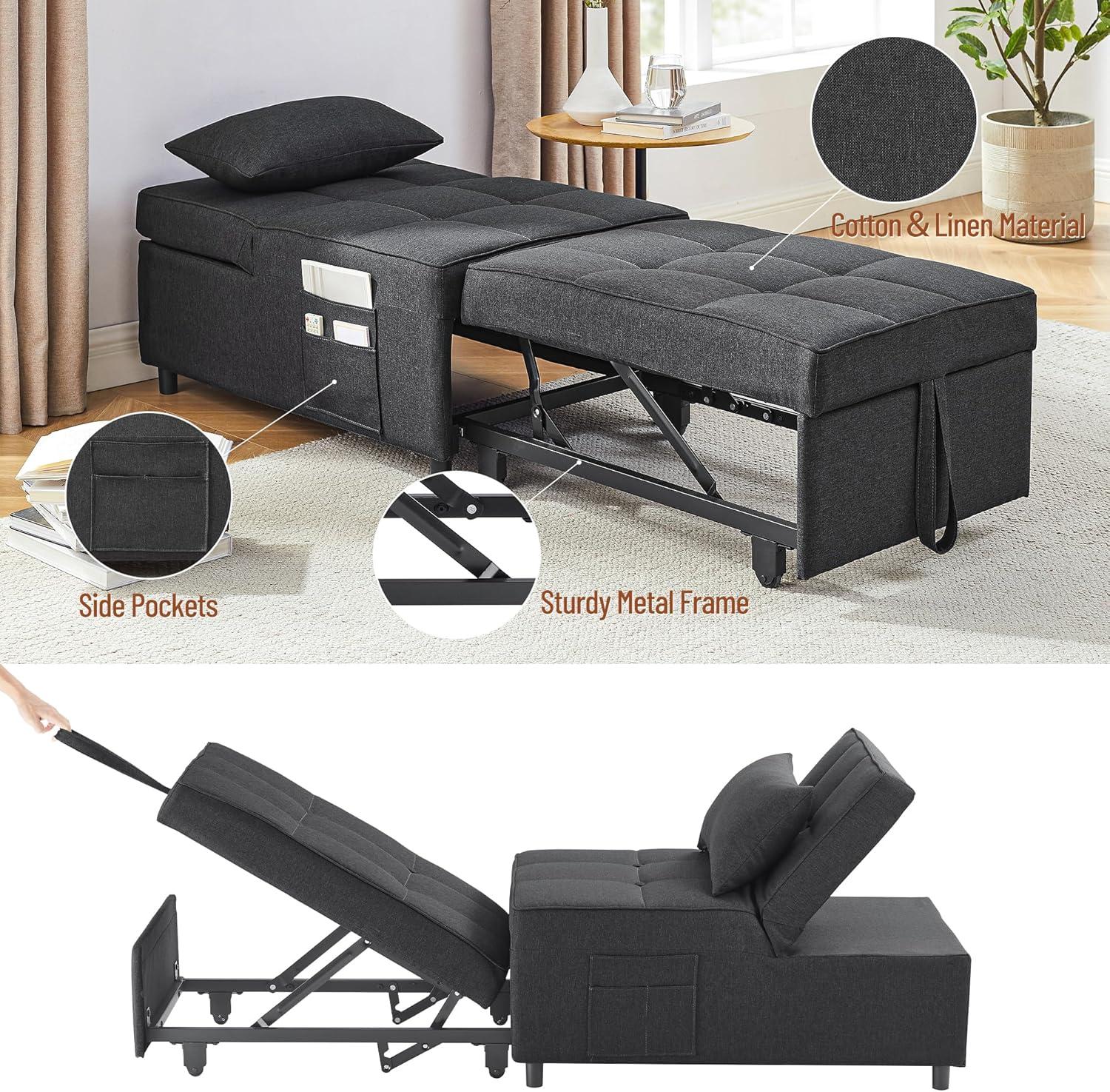 We found this 4-in-1 multifunctional sleeper chair to be an excellent space-saver that adapts effortlessly to both living rooms and bedrooms. Its compact size fits snugly into smaller rooms without overwhelming the space,making it ideal for apartments,dorms,or guest rooms. The sleek dark gray fabric complements a variety of interior styles,while the strong steel frame supports up to 330 lbs, offering durability alongside style. Plus, with large side pockets, keeping essentials close – like remotes or magazines – becomes second nature.