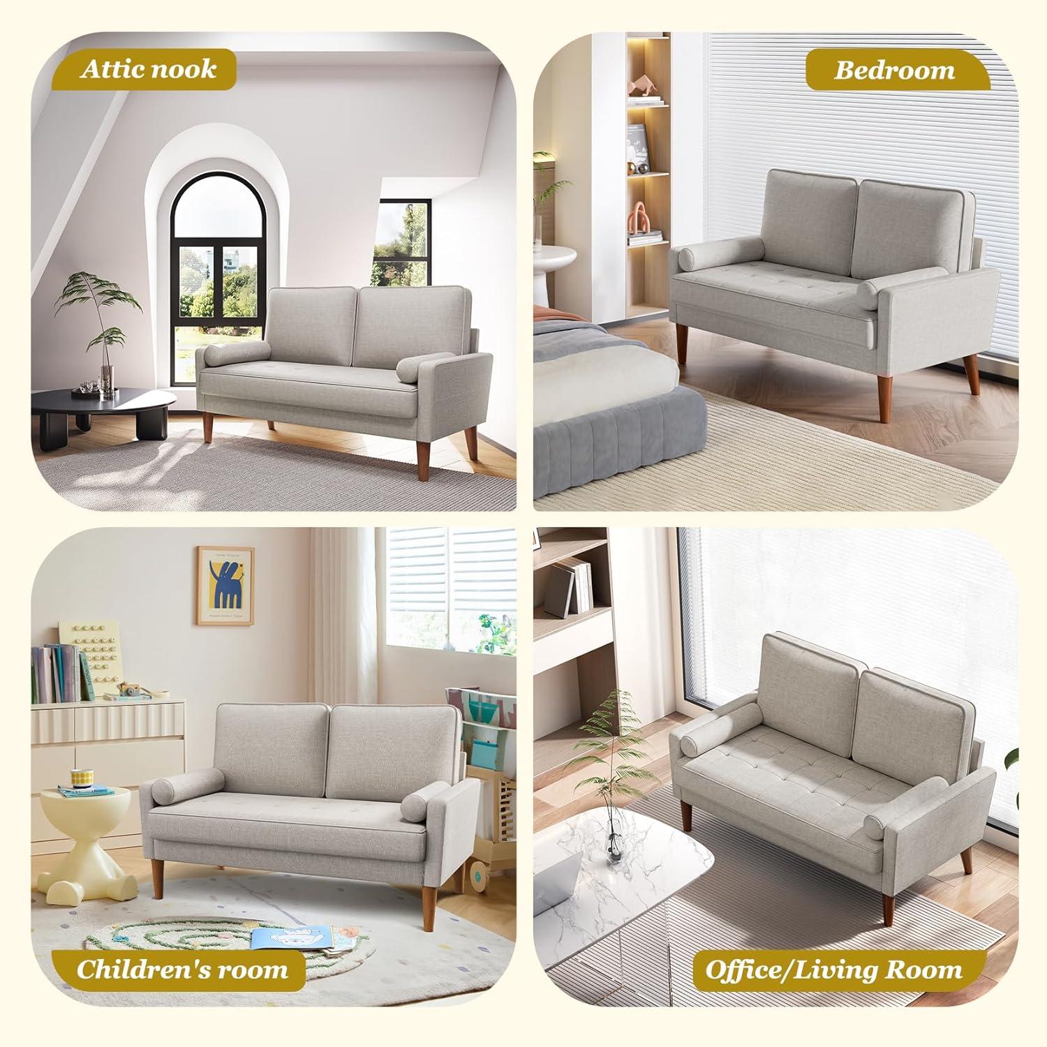 This loveseat stands out with its perfect blend of functionality and style, designed specifically for cozy living spaces. Its compact footprint makes it an excellent choice for apartments, bedrooms, or any small room where maximizing space is crucial. The sleek, mid-century modern aesthetic is enhanced by the solid wood legs, giving it a timeless yet contemporary look that complements a variety of interior decors. We especially appreciate the breathable, linen-like fabric which not only feels gentle to the skin but also remains comfortably cool during warmer months, making it a practical and inviting piece of furniture.