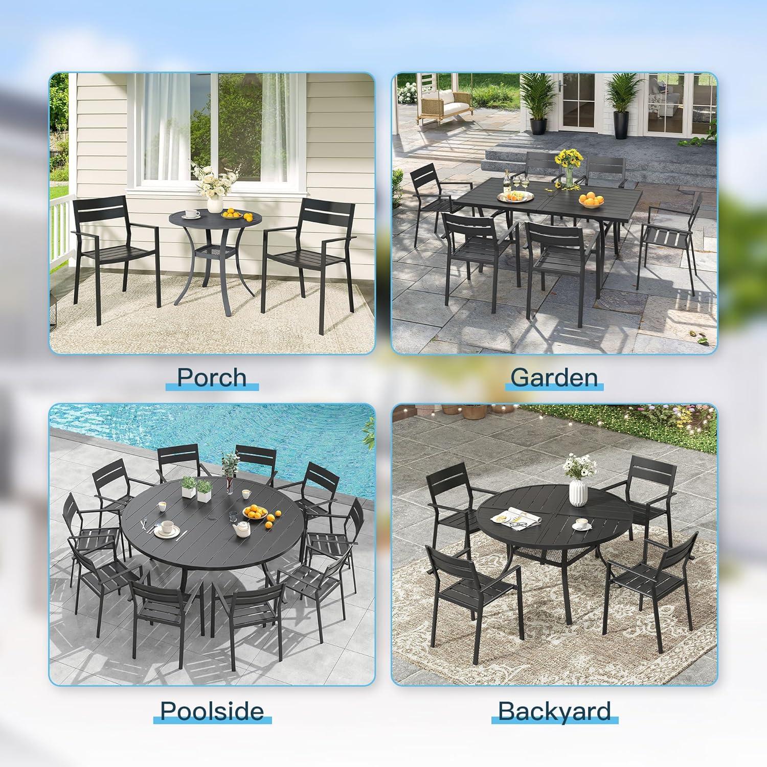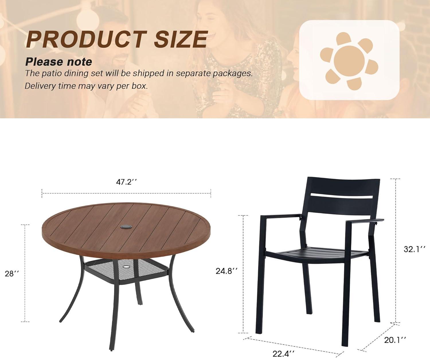 After spending considerable time with this outdoor dining set, we can confidently say it combines elegance with practicality in a way that suits a variety of outdoor spaces. The sturdy wrought iron frame, enhanced by a high-performance powder-coating technique, ensures long-lasting resistance against weather elements, meaning it will maintain its fresh walnut and black finish for years with minimal upkeep.The stackable chairs are a true space-saver and impressively comfortable even without cushions.Plus, the well-sized 48″ round table comfortably accommodates 4 to 6 people and includes an adjustable umbrella hole, making it versatile for sun or rain protection during dining or lounging.