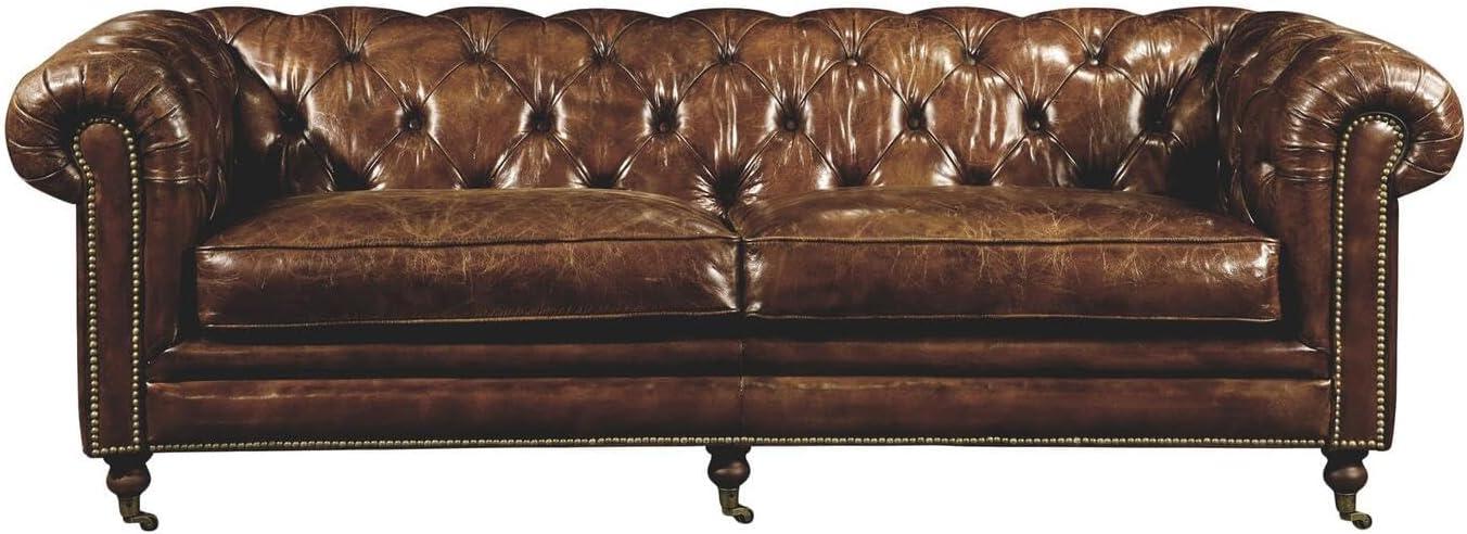 Light skimming the deep diamond-tufting makes the leather gleam, and you catch yourself running a hand along it — cool, slightly textured, with a hint of waxed patina.Vintage Variety’s Birmingham spans roughly seven and a half feet, and it’s visual weight quietly anchors the living room: the brass nailheads and small wheel accents catch the light when you pass. The seat holds a clean, steady line — removable cushions tucked in with Velcro — while the low, five-inch legs lift the form just enough to let shadow and floor show beneath. Up close, the top-grain hide and solid frame read less like a showroom piece and more like something that’s already part of your daily rhythm.
