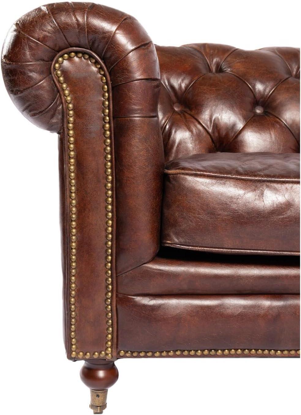 As the sofa ages in daily life, the leather shows the kinds of changes that come with touch and movement: subtle creases at high-contact points, a slightly warmer surface where people rest their arms, and occasional scuffs that pick up light differently than untouched areas. The frame’s heft gives a sense of permanence when repositioning; moving the piece is usually a two-person effort and often leaves impressions on carpet until it’s settled. Spills frequently enough bead briefly on the surface but demand prompt attention to avoid leaving a mark, and the deep seat corners created by the tufting can collect small debris over time, prompting periodic vacuuming or a quick hand sweep.