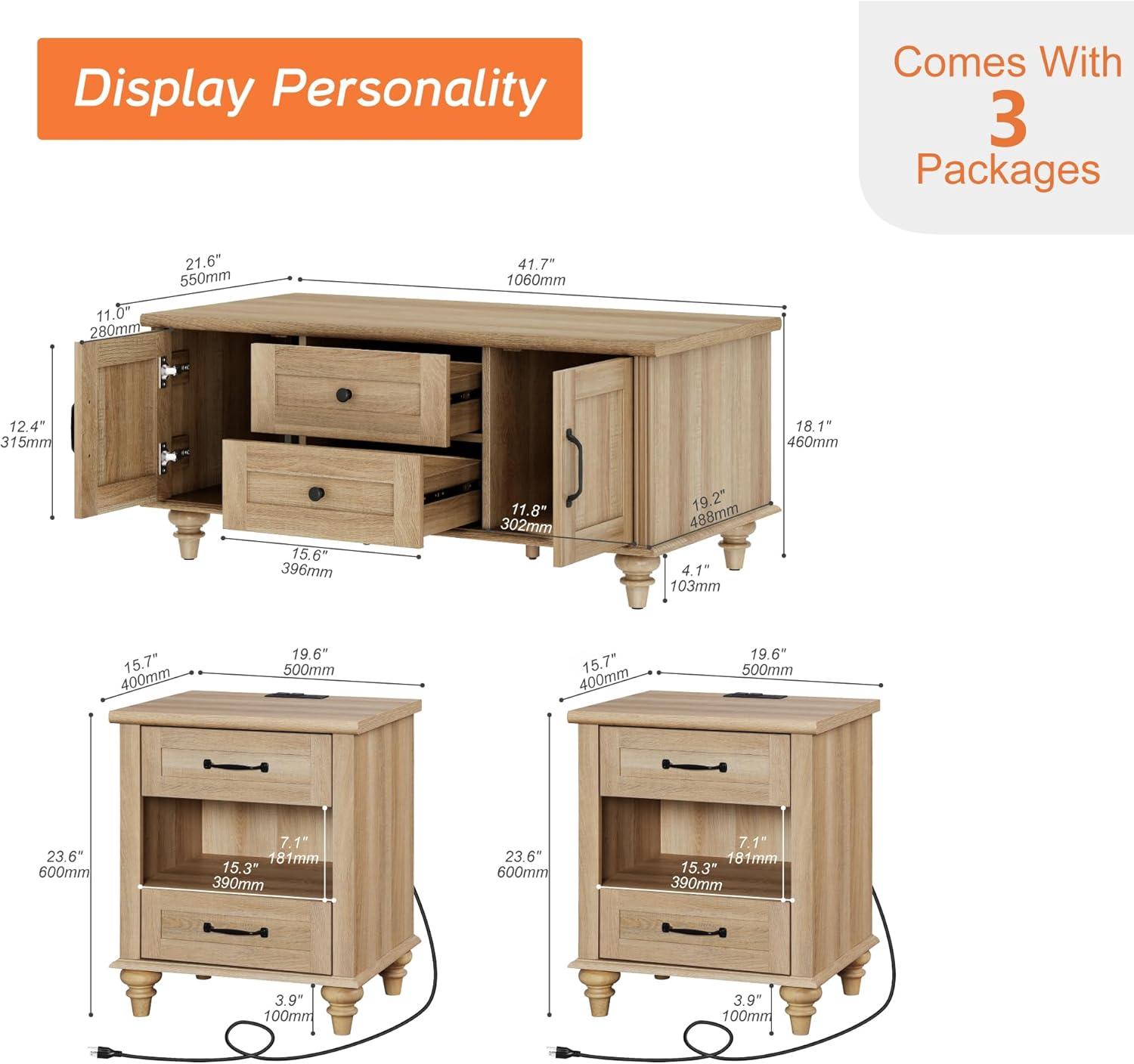 this three-piece set brought a charming farmhouse vibe to our living room with its oak distressed finish and wood grain tabletops. The centerpiece, featuring two drawers and matching storage cabinets, provides ample space for organizing everyday essentials like remotes and magazines. We appreciated the thoughtful design element where both the front and back of the main table have the same polished look, allowing versatile placement without worrying about aesthetics. The side tables impressed us further, boasting built-in charging stations equipped with dual AC outlets and USB ports, making device charging both convenient and organized.