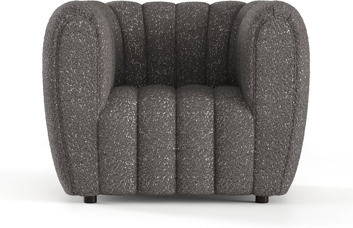 Our frist look left us impressed by the restrained glamour — the vertical channel tufting and textured boucle give the set a modern sculptural feel while the charcoal gray offers depth without overpowering a room. We appreciated the subtle metallic undertones that catch light in different ways, making the chair, loveseat, and sofa read as a cohesive trio that suits everything from Scandinavian minimalism to richer contemporary palettes. The silhouette is clean and composed, balanced by solid wooden legs that ground the pieces and hint at long-term stability. Textural excellence is obvious at a glance: the boucle feels soft to the touch yet structured enough to maintain the elegant channel lines.