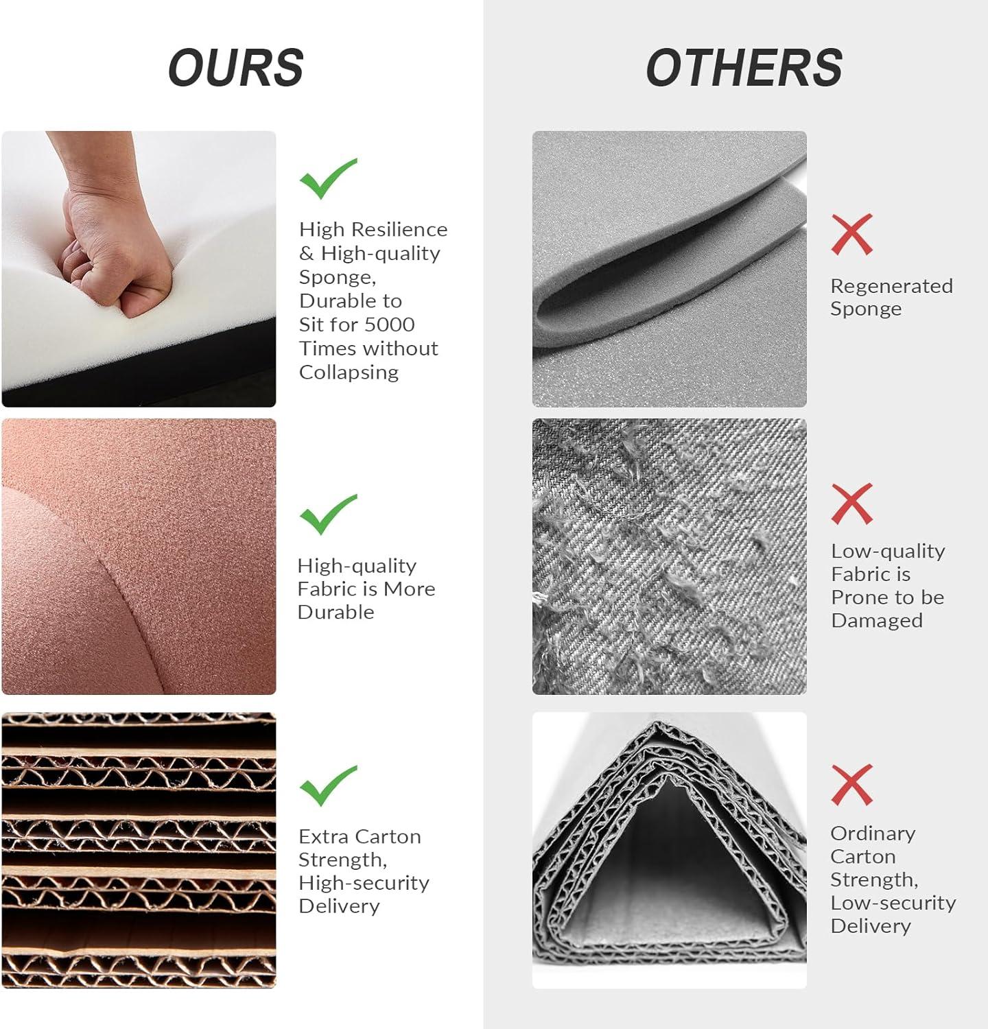 We immediately notice how the velvet feels — soft and skin-friendly, with a short, even pile that invites you to sit. The thick spring-foam filling gives a responsive, supportive seat and backrest that resists sagging over time, and the curved, flower-shaped back keeps its sculpted look instead of flattening out. We also pay attention to safety notes: keep away from open flames and high heat, and supervise children and pets since the set is not certified for child safety. our quick inspection checklist for the upholstery includes: