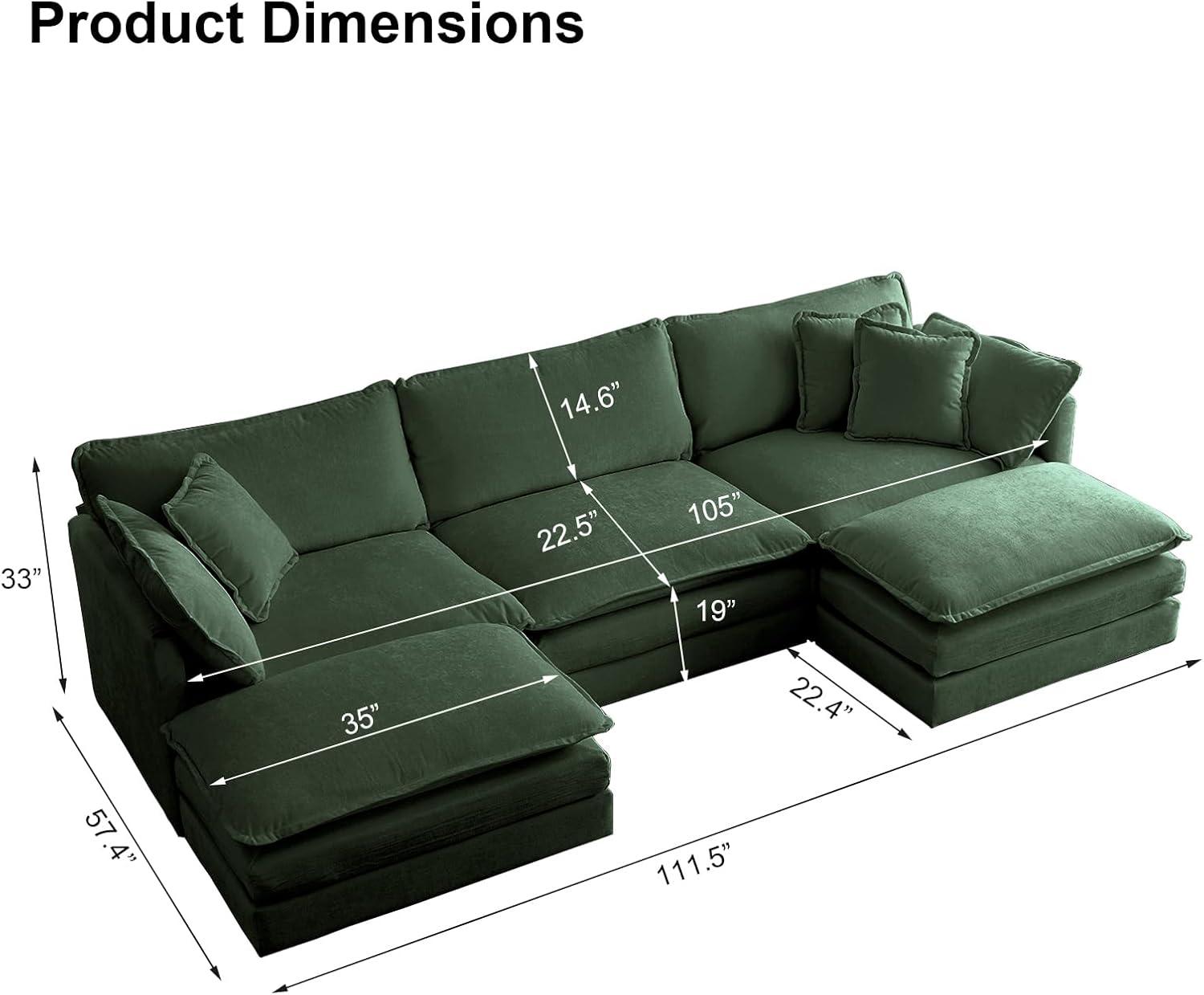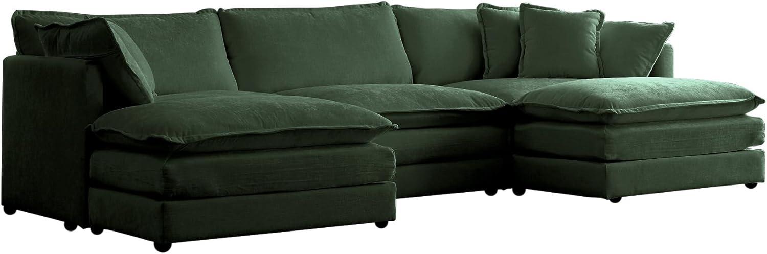 We brought the KIVENJAJA Chenille U-Shaped Modular Sectional Couch — the green, cloud-like 3‑seater with two ottomans and five pillows — into our apartment to see whether the photos matched the reality. The thick mercerized chenille promptly reads luxe and cozy, and the cushions (a mix of doll cotton, high‑density foam and springs) give a noticeable sink‑in softness without feeling unsupported.The frame, a mix of solid wood and metal with heavy‑duty plastic legs, felt reassuringly stable during our testing, and the 111.5”W x 57.4”D x 33”H footprint (25.2” seat depth, 19” seat height) proved spacious for lounging and casual gatherings. We also appreciated the modular flexibility — the ottomans and sections are easy to rearrange into different configurations — and found assembly straightforward with the included tools and instructions. In this review we’ll walk through comfort,construction,versatility and practical details from our hands‑on experience.