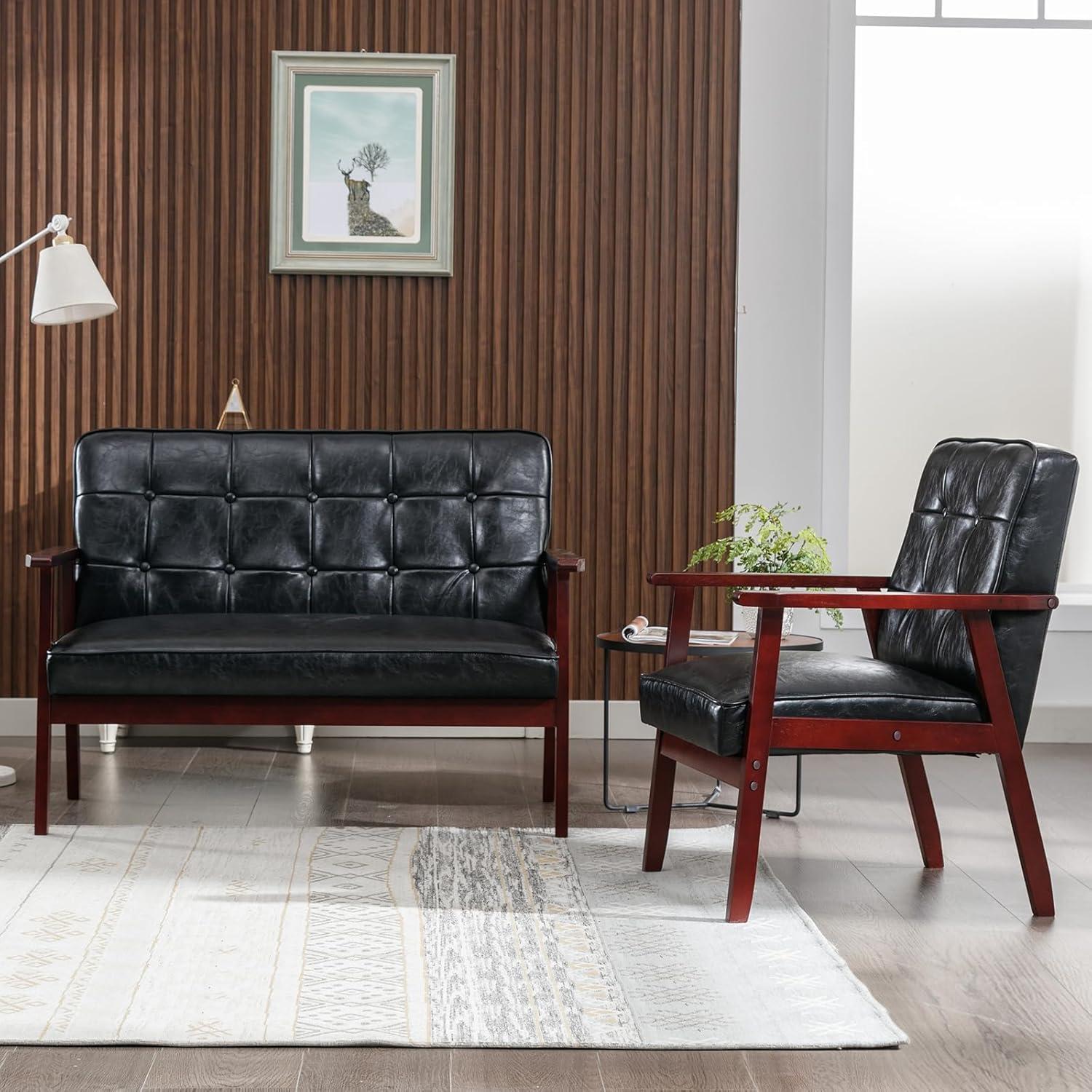 Black, compact, and quietly confident — the Okeysen Modern Loveseat Sofa Set arrived at our apartment promising a mid-century silhouette with modern ergonomics.We unboxed the two-piece set (a 2-seat loveseat and matching accent chair), read the safety and assembly notes, and found the parts and instructions straightforward enough to finish in under an hour.From first sit, the ergonomically curved back and thick high-density cushions felt supportive rather than sinking, and the button-tufted leather with wooden armrests gave our small living room a polished, retro-modern edge. assembly required attention to the hardware — we made sure every bolt was tightened and kept the pieces away from pets and children during setup — but nothing surprising showed up in the process.