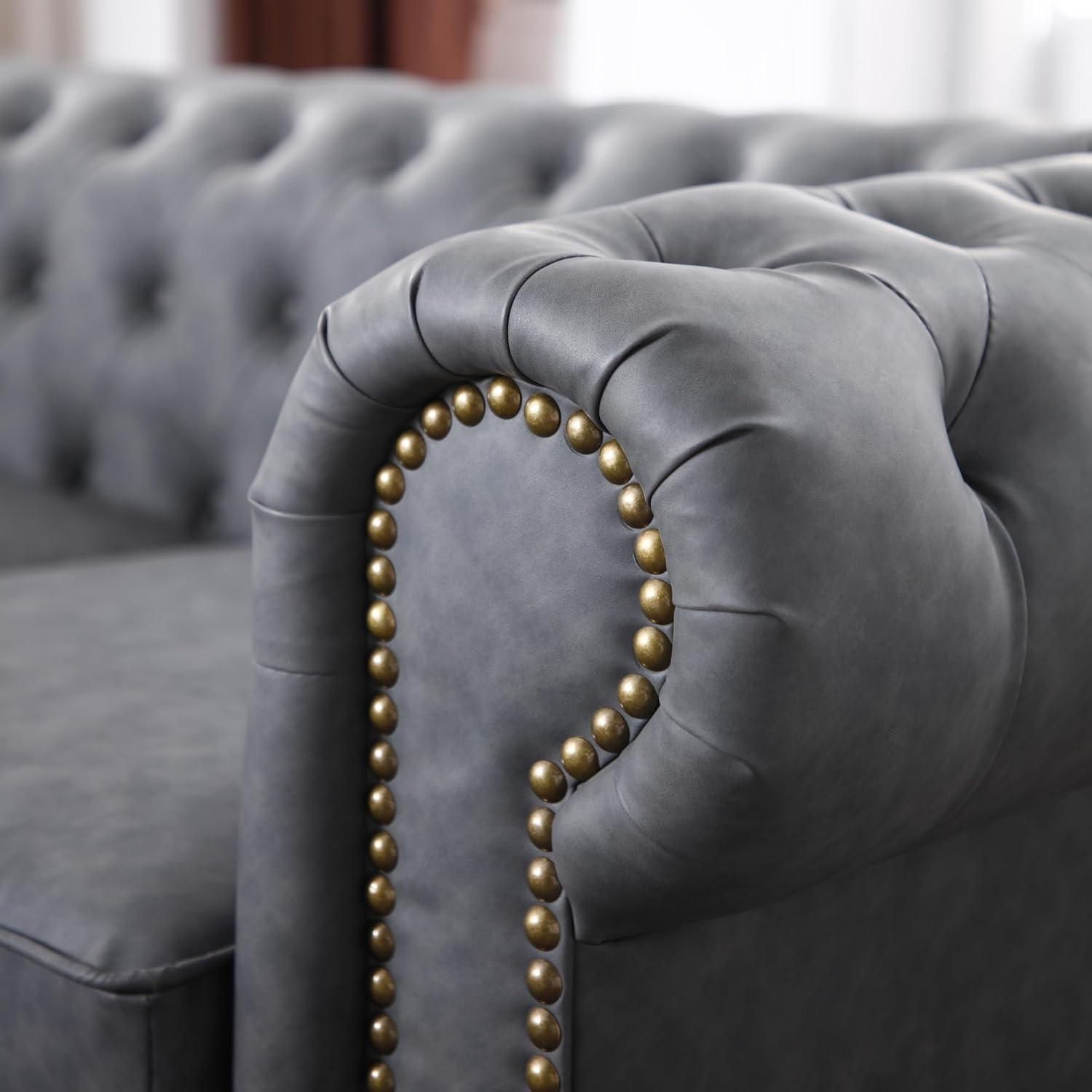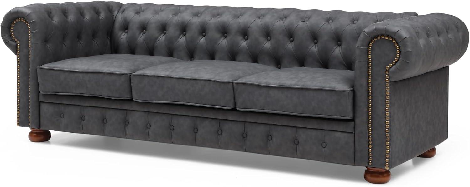 From the moment we unboxed this elegant Chesterfield-style piece, its sturdy build and thoughtful design became immediately apparent. Crafted with a solid wood and metal frame, it promises long-lasting durability without compromising on style. The vintage dark grey faux leather upholstery lends a sophisticated touch that effortlessly complements most modern living spaces. Adding to its comfort is a 6.5-inch thick seat cushion filled with high-density foam and polyester, ensuring ample support for three people while maintaining its shape over time. Although the back cushions are absent, the firm seat and round armrests create an inviting and balanced seating experience.