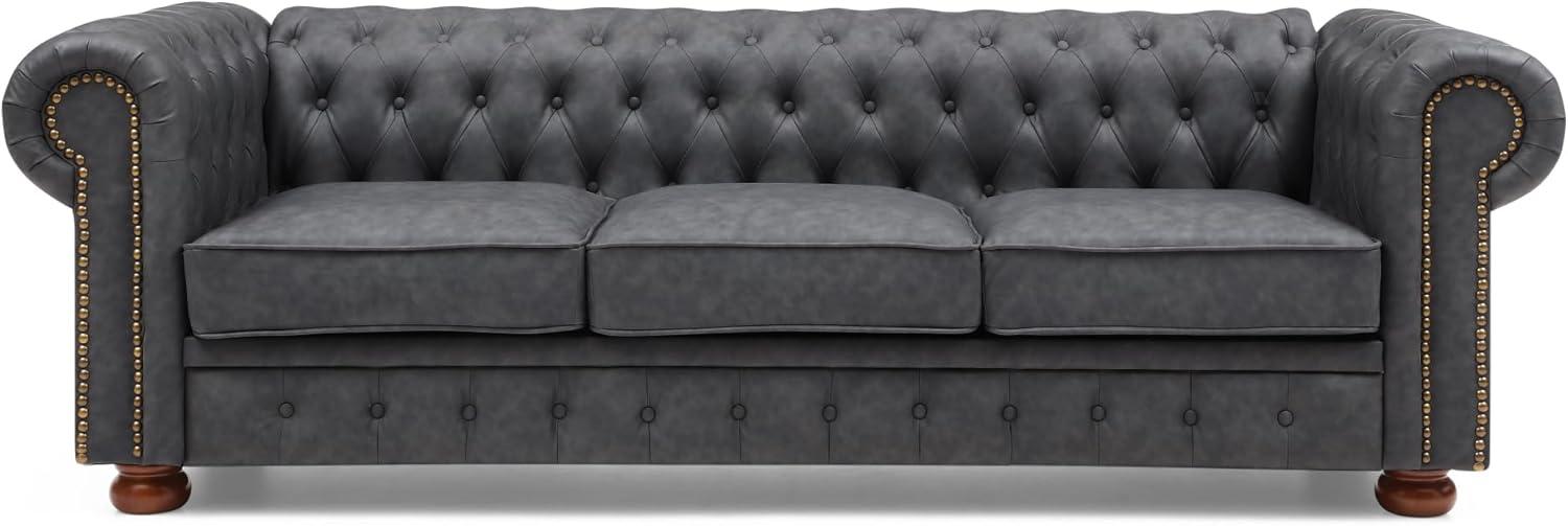 • Classic Chesterfield design with round arms and a dark grey finish perfect for various interior styles.