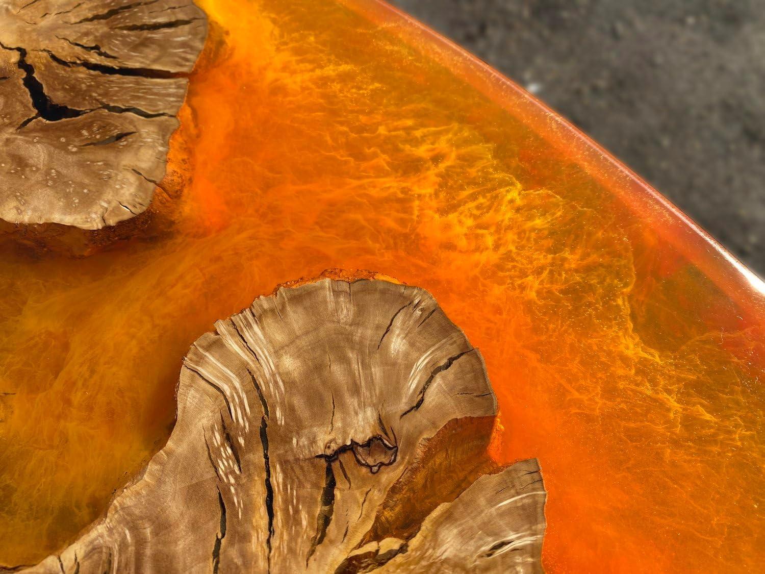 What truly sets this piece apart is the meticulous attention to detail combined with artisanal craftsmanship. Each table is a testament to the harmony between natural wood and vibrant epoxy resin, resulting in a stunning “orange lava” effect that naturally draws the eye.The resin flows seamlessly alongside live-edge wood patterns, creating an organic yet modern aesthetic. We especially appreciate how the manufacturing process involves continuous customer participation, with periodic updates and approvals ensuring the final product perfectly matches our vision. This personalized approach makes each table not just functional furniture but a unique work of art tailored for our living space.