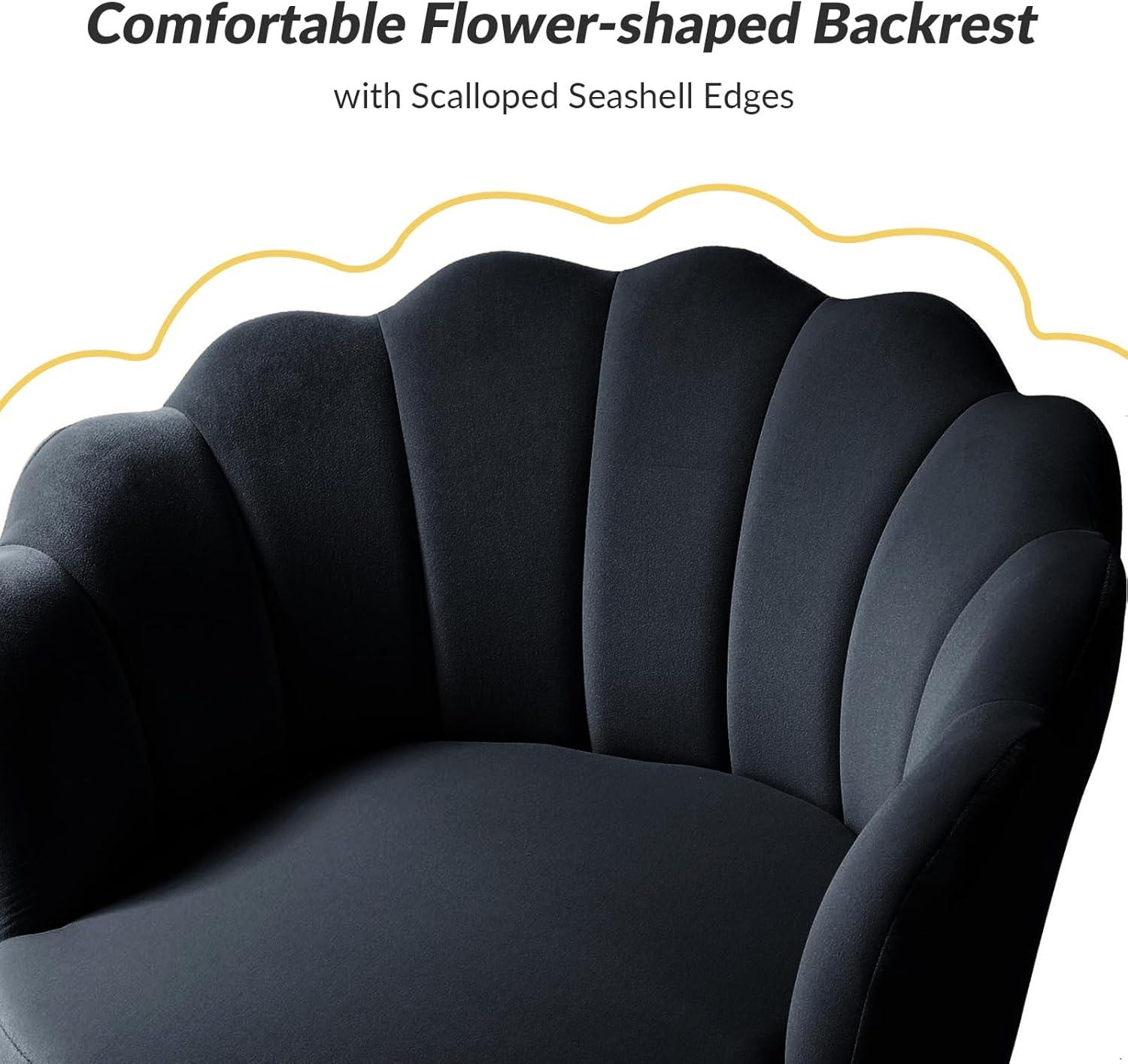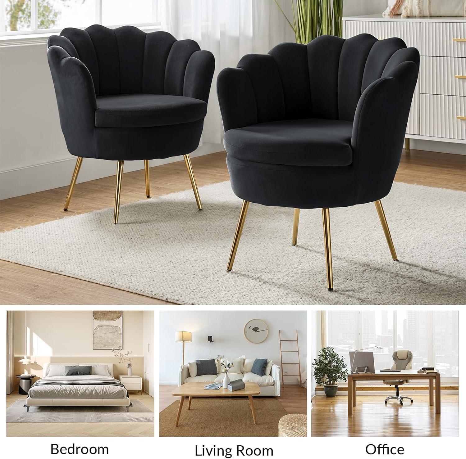 These chairs blend seamlessly into a variety of spaces thanks to their elegant design and functional features. Whether positioned as vanity chairs in a bedroom or as stylish accents in a living room, their plush velvet upholstery and ergonomic petal-shaped backs provide both comfort and visual appeal.The soft, 9-inch thick cushions make lounging a true pleasure after a long day, and the curved back offers gentle support-ideal for makeup sessions or casual relaxation alike.